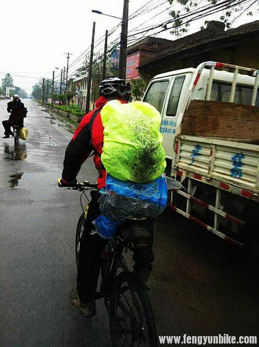 听昨天的骑友说,第一个大坡就有三十多公里,我们要爬七个小时。被誉为“大熊猫故乡的秦岭”山路以险峻著称。据说这座山比藏区的坡还要难爬。大家顶着小雨在寒冷的风中哆哆嗦嗦的骑行了五十公里,一路站站停停。刚开始我的自行车因为没有后架,水都带到了衣服上,裤子不一会就全湿了,顺着裤裆都留鞋里去了。实在不行了,大爷在我们避雨的时候给我做了一个防雨的屁帘子。刚开始还行,后来还是顺着裤子在流水。实在没办法远方的刘恒大师给我想了个办法,让我去买卫生巾把裤子给隔开。到了路边一个超市,我也不好意思去问。我让老付给我去问的结果:店小没有大的那种,尿不湿也没有,只有小的那种。我也没用过啊,老付教了我半天,我把一包都粘上了。确实挺管用的,不那么凉了,又找了个塑料袋垫在了车座上。这回没那么冷了。