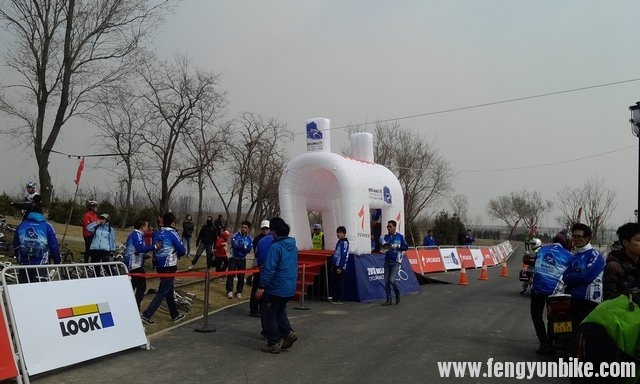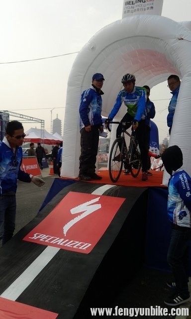 发车台。选手先从台阶这一侧扛车上去,到了台上之后,由工作人员扶着,保持平衡,选手可以两脚都上好锁,等待发令。