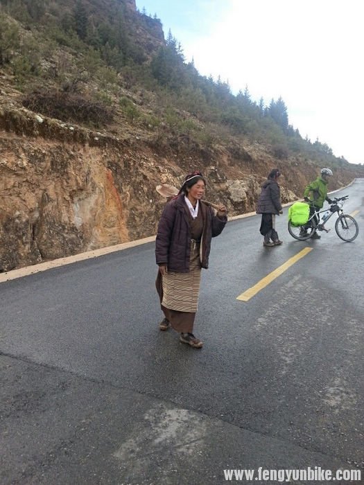 进入西藏要查身份证,很多手续,我也没明白什么意思。今天骑行太累了,喝了酒真心骑不动车。进入西藏的骑行,所有的地貌发生了很大变化,都是在山谷里顺着河道在前行,一直在爬坡。我累的下车站都站不住了,但是我也没想搭车,心里真的很纠结,也许就是一念之差。后来下雨了,真是受不了了,全身都湿了。好不容易找了个吃饭的地方,吃了点面条,这身上冰凉啊,动一下都觉得冷的啰嗦。这是我第一次有想搭车的想法,当时我还特别头疼、很困,但是最终我还是坚持住了。雨小点的时候准备出发吧,刚走了五公里太阳出来了,不一会就把衣服烤干了。心想老天爷还挺好,晒晒太阳挺好的。这时这坡真是给我们吓到了,盘山路就有十五公里,怎么也要爬三个小时。怎么所有的困难都到一起了呢?爬吧,大哥一直在前面,我在后面听着歌曲爬行,突然间我一回头看到两个藏族妇女,吓死我了!她比划半天我也听不懂,我说话她们也听不懂——原来她们想帮我们推车
