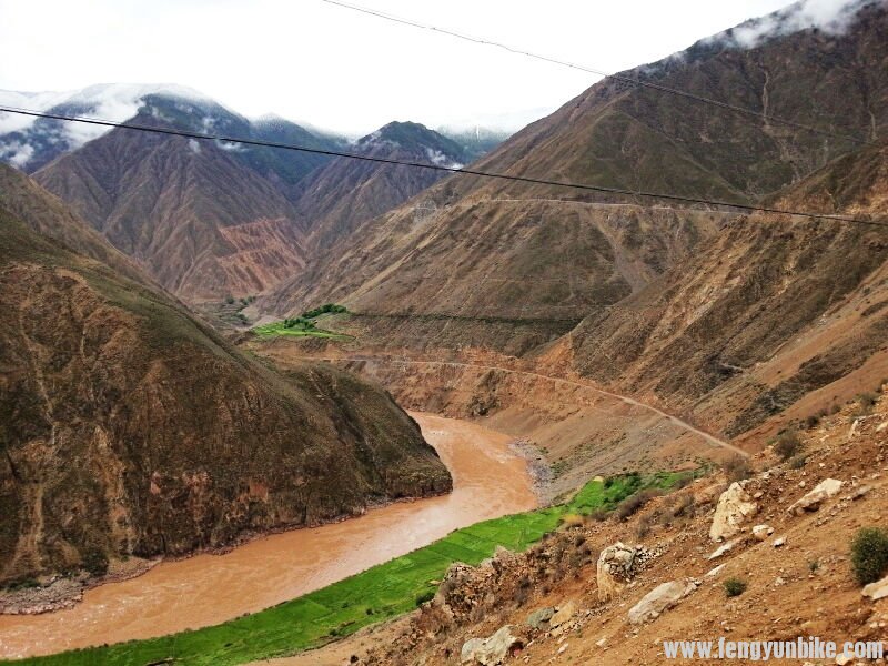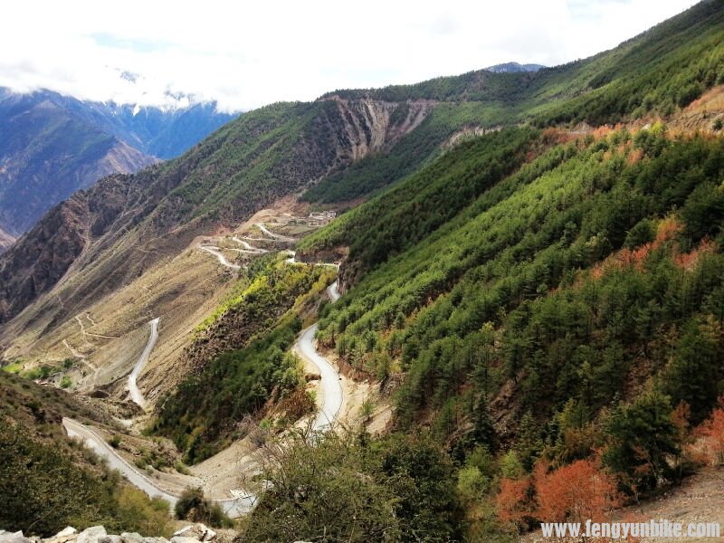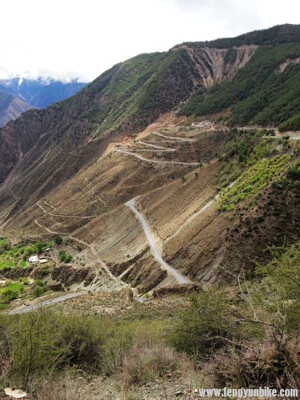 从如美出来就开始爬坡,我们沿着澜沧江缓上,八公里到达觉巴山山脚下的小村庄。今天一天差点吓死我,我把后刹车的一个螺丝给拧坏了,这下可CD了!到了山脚下,我在螺丝里垫了塑料布,结果还是不行,彻底是不能用了。这下山要是没后刹车和自杀是一样的。我心想完了,这回要搭车了,心里真的很不甘心,关键是我这车谁能修啊?回成都?去拉萨真TM闹心。在这“千钧一发”的时候,刘大哥说你看看这个螺丝能不能用?我这一看,严丝合缝啊——真TM的幸运!刘大哥干的做有意义的事情就是带了这个螺丝!螺丝上好,就开始了登山,一直爬山,但是没见过坡度这么大的山,真的很陡啊。但是今天状态很好,一直爬行了12公里才到半山腰。这个坡只能你们看了 没法用一张图片展现这座CD的山了。