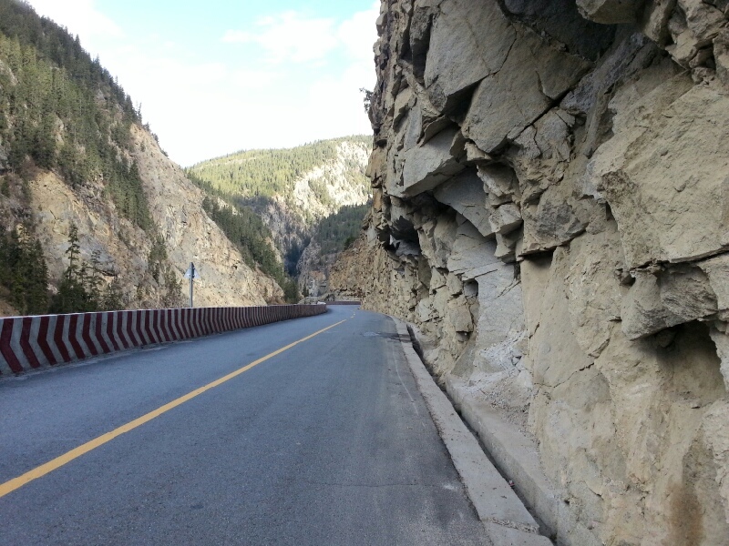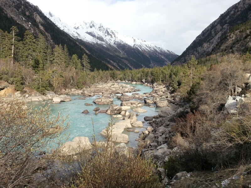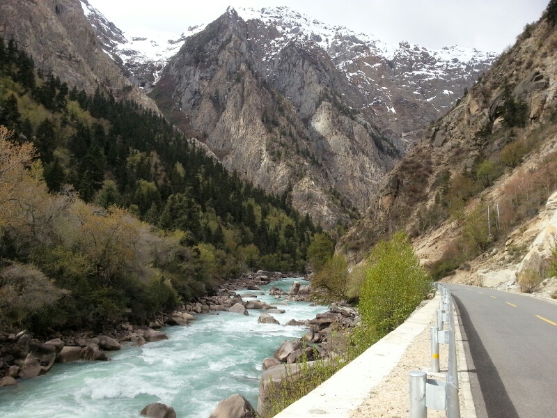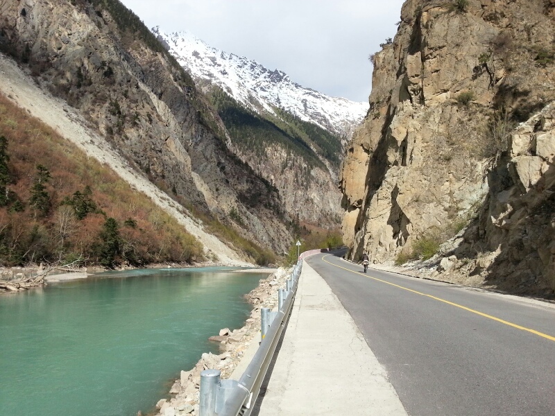 20130516,骑行第42天,川藏第18天. 然乌(K3880 海拔3960)-米堆(K3911)-中坝(K3932 海拔3330)-松宗(K3965)-波密(K4004 海拔2725):柏油路:132km离拉萨还有六天。 今天实际里程可能在130km左右。今天也可能是进入西藏以来最爽的一天,我们大部分时间在林间穿行,而且绝大多数路段为下坡,沿途可见到很多雪山、冰川,安目错湖和帕隆藏布江也在今天的行程当中。 我们从然乌镇出来,一直沿着安目错湖前行。12km后的,湖水开了个口子,决堤似地流了出来,这就是帕隆藏布江的源头。G318就是沿着雅隆藏布江一路向西而下的。 帕隆藏布江,还是一条小河。 离开然乌镇18km左右,原来的土路已经新铺成了柏油路。这段新路34km左右,灰常爽,一直持续到离然乌53km的中坝村。中坝村前行33km是松宗,这里应该是个镇吧。松宗过后约43km到达波密县城。 今天的路上有米堆冰川景点。不过想爬到冰川上,估计需要好几个小时。经过一个山坳里的小村庄,红色的屋顶在雪山的映衬下格外好看。 中坝后路况很好,柏油路直到波密。 蓝天、白云、雪山、森林,还有你。独一无二的318! 社会主义的康庄大道--还有30公里到波密噢!