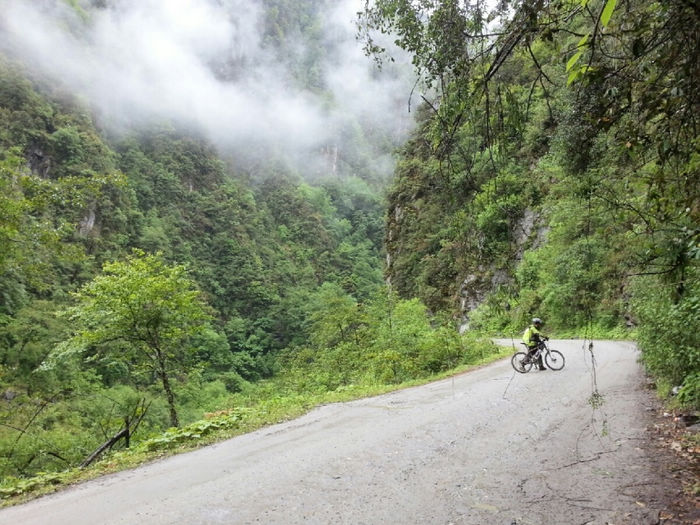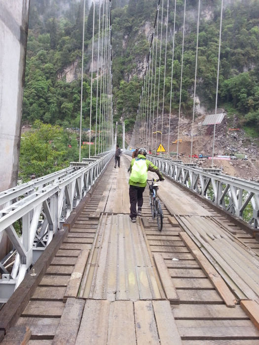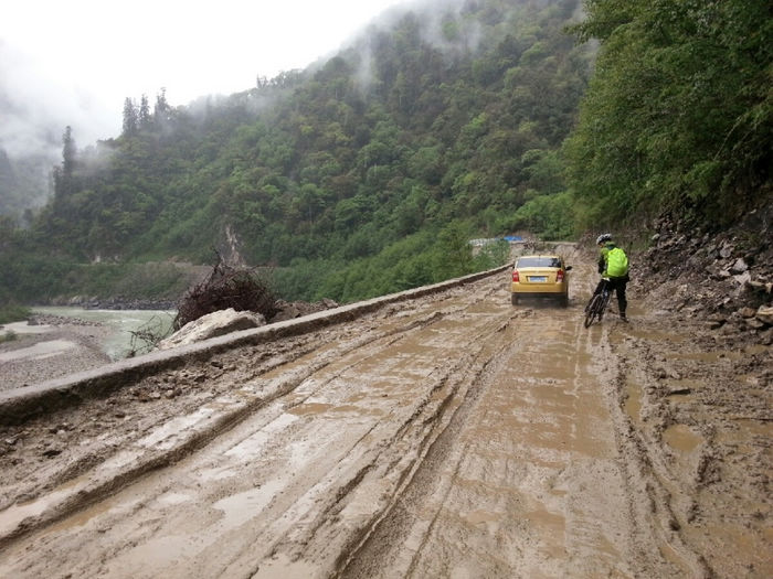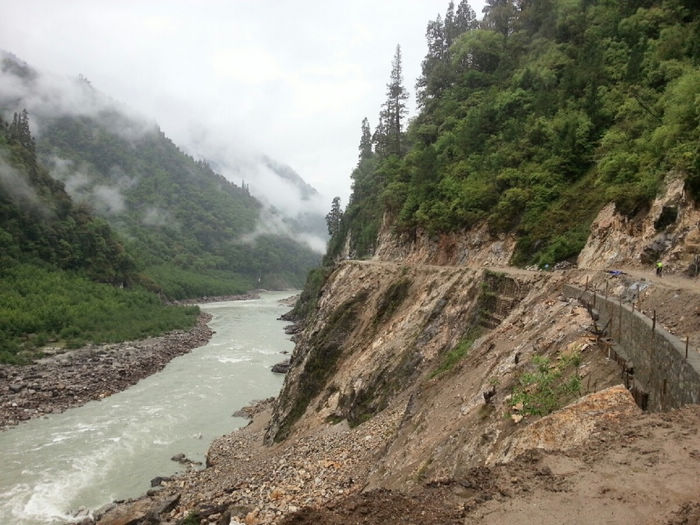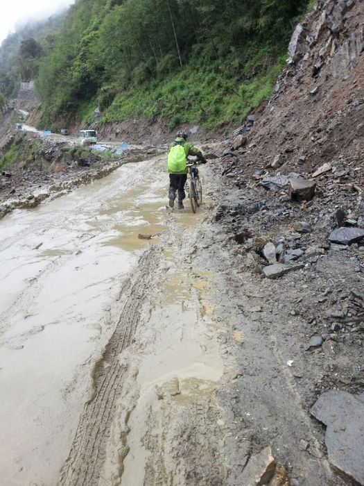 20130518,骑行第44天,川藏第20天。 起点通麦终点鲁郞。骑行75公里'天气小雨转中雨。中雨转小雨。下了一天没停。 离拉萨还有四天路程。没想到啊'最烂的路。最险的路。最陡的坡'最糟糕的天气'都赶在了今天。本以为只有70公里路程就没着急'早起下雨'吃完早饭我俩还回去睡了一觉。十一点雨小点了才出发。出了城就是易贡藏布江大桥'有重兵把守。每次只能走一辆车。我们顺着桥边溜了过去。过桥就是烂路。奇烂无比啊。坡度还特别的陡。车子可遭殃了'一路的越野车啊'什么吉普啊'丰田啊'港港的刮底盘啊'厅堂厅堂的听着都心疼。还是自行车通过性好啊'今天的路无法形容。整个路都是在半山腰抠出来的'底下是能吞没一切的雅鲁藏布江。水流湍急啊'骑到了终于在骑行了十五公里'中午吃了碗方便面就又继续骑行了'刚出了排龙天险就塌方了。这是著名的102塌方区'塌方也很正常'真是坏事都赶到了一起。等了一个小时才通过'走了三十公里烂路结束'全新的柏油路。但是我现在就已经精疲力尽了。尤其是刘大哥的车子。我骑着不习惯'屁股像是着火了一样疼。我的车子我还不能骑了'坐杆太低。真是每一秒都是在煎熬啊。下午四十公里几乎都是上坡。我给自己的鼓励是骑行十公里抽烟一只。剩下最后二十公里的时候天已经黑了。雨下的也大了'气温下降的很快'几乎一直没休息'一直骑到了快十点以为到了鲁郞'结果是个村子'以为这回到了吧'一看是个工地'在大山深处那一盏灯光对我来说是那么的亲热。就这样一次一次失望'到了鲁郞十点多了'惊喜都没有了。只剩下无穷的疲惫了'吃饭烤火睡觉'住的地方那叫一个好'简易房子'四外漏风'辈子湿的能拧出水来'这还让不让人活了啊'雨还在下'这是写日记最晚的一天12点20'折磨死人的一天。