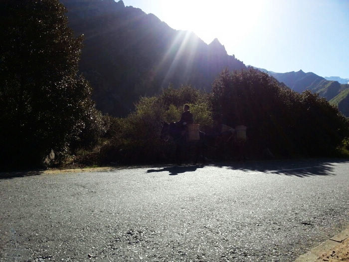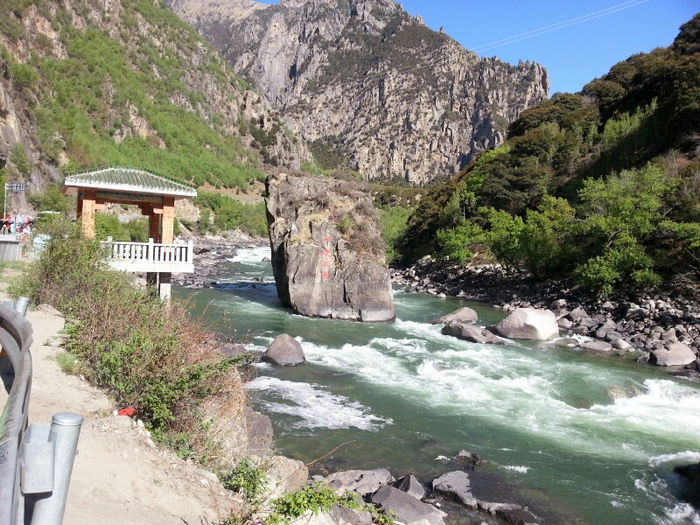 20130521,骑行第47天,川藏第23天。 八一(林芝地区)( 海拔2930)-更张镇-百巴镇-巴河镇-工布江达(海拔3440):柏油路:130km 从八工布江达( 海拔3440)-金达镇-加兴乡-松多(海拔4288):柏油路:98km。天气晴' 今天的路况和昨天一样的好,不过近100km的上坡路。差点给我俩搞死。今天海拔会上升接近1000m,而路上的车也由于接近了拉萨变得多起来。 出了工布江达,我们继续沿着美丽的尼洋河前进。今天延续昨天的缓上坡,不过坡更陡一点了,河水也随着地势的升高逐渐湍急起来。K4378后进入山区,几分钟便可看见一块巨石挺立河中,上书四个大字:“中流砥柱”。这是林芝一大景点。该石被当地藏民奉为神石。传说这块巨石是“贡色德姆”修身养性坐禅念经时的坐椅,上面还种有夹竹桃。大石上被信众扔上了很多哈达以表敬意。 今天K4383到达太昭古城,前行不远到达有四古之称的景点:太昭古城、唐蕃古道、茶马古驿站、清朝古墓群。看了一下没什么意思。 松多兵站附近的路面早已经修好了,全部为柏油路。K4444里程碑处可以停留一下,稍作休息。藏族同胞好像也信“4”音的不吉利,这个里程碑上被捆了哈达和树枝,还写有藏语。 K4453是木材检查站,转过弯后就可看到右方的“松多温泉”,前方是松多村彩色的房顶、高耸的移动信号塔。松多(K4456)是个小地方,不过因为这里面是到拉萨前的最后一个休息点,所以饭馆和旅舍很多。 松多海拔4300左右,夜空很清透,真正的繁星点点,一条银河贯穿过天穹。就算是在盛夏,这里的夜晚都很冷。在这样美丽寒冷的晚上,穿上外套,随便找个地方,抬头看看天空,任由心飞...... 又是艰苦的一天'怎么快到了'症状还多了呢'屁股快骑着火了。特殊的疼'手腕也很疼'腰疼'脖子疼'没不疼的地方了。越是着急越骑不动。坚持吧'距离拉萨还有178公里'拉萨我来了。