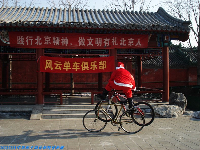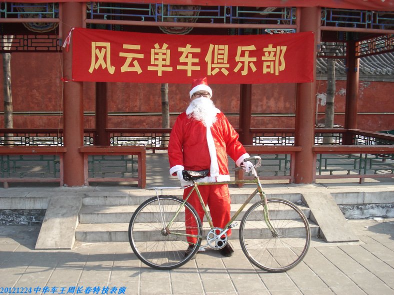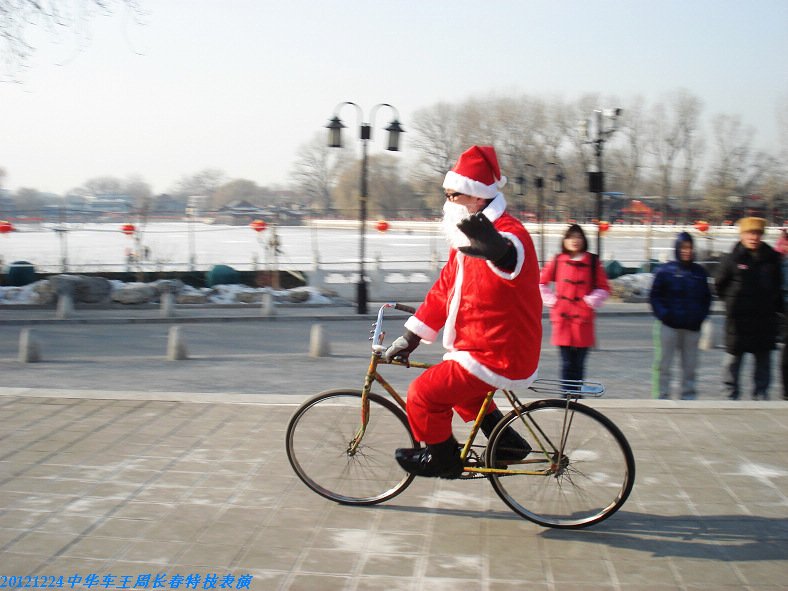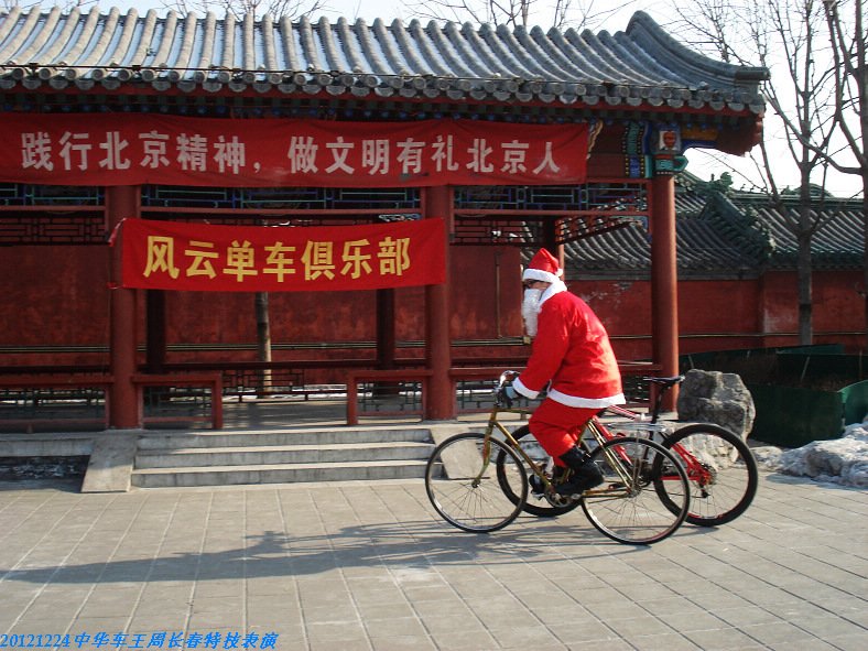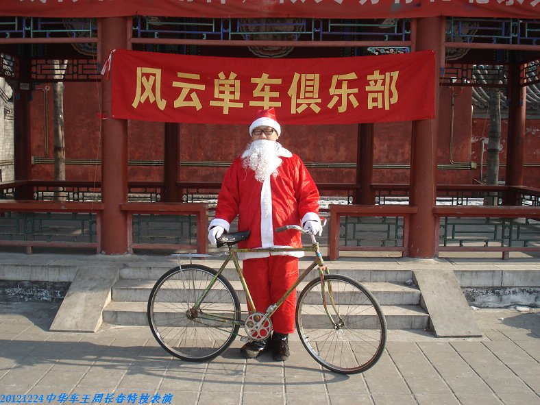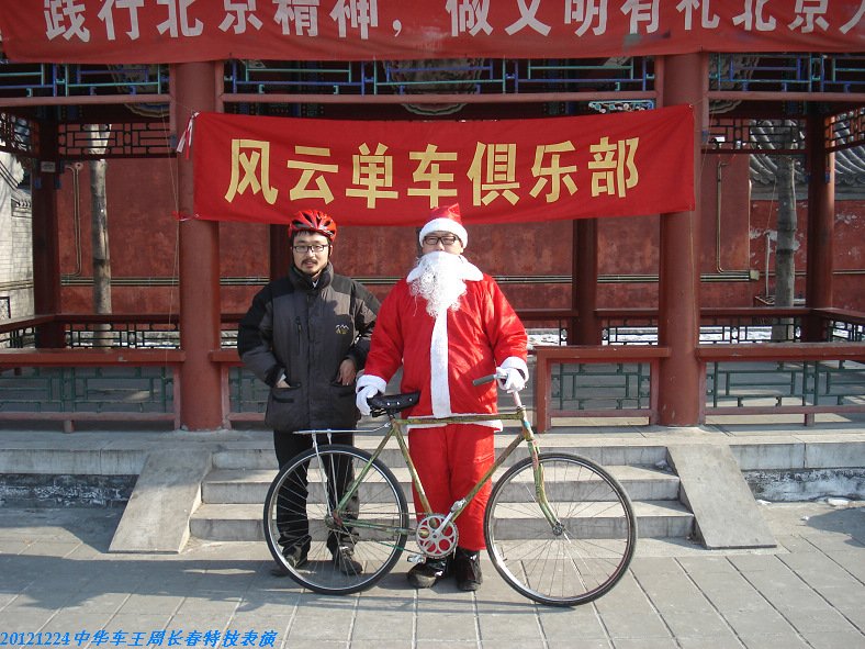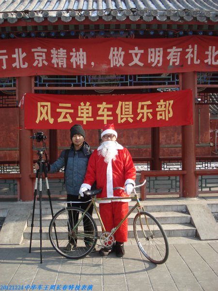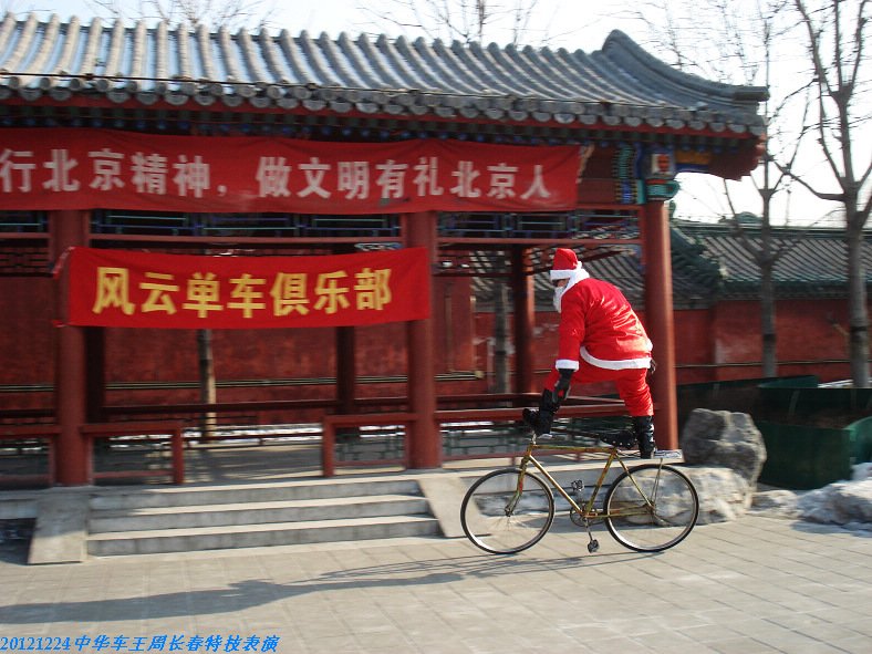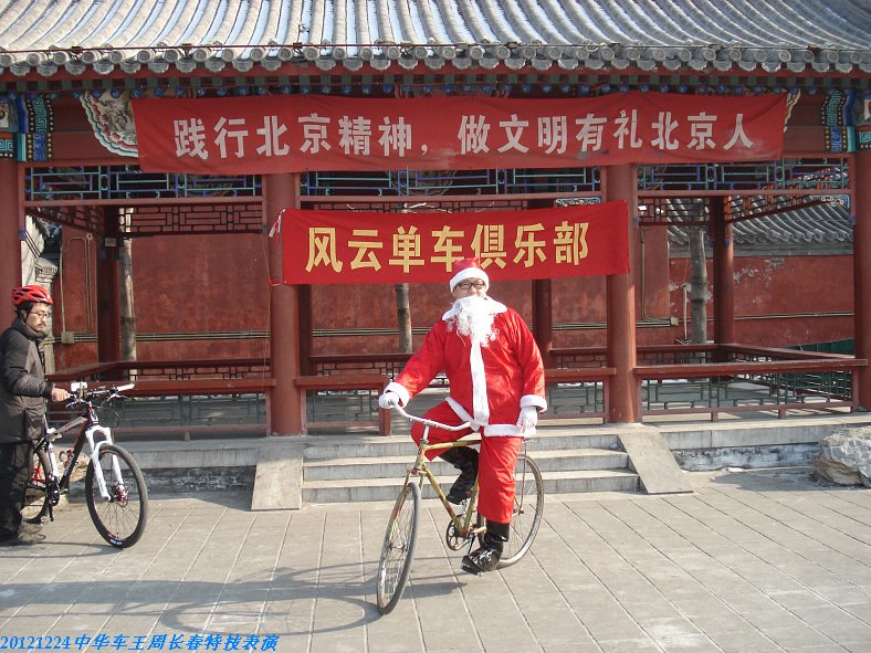 美国有“超人”那是科幻的,中国有“孙悟空”那是神话的,“地球超人”那是艺绝天下的。 第一次见“中华车王”周长春先生,还是在去年文博会风云单车的专场。当时“车王”以一辆没有车闸的普通自行车为道具技惊四座,眼花缭乱的动作看的人目瞪口呆。 今年的文博会风云单车文化展,“车王”又来了。而且带来了他的“2013倒骑车周游世界”的宏伟计划!展会最后一天,“车王”神秘兮兮的拎来一个纸盒,告诉我,这是一套圣诞服——明天,也就是24号中午时分,他要在什刹海冰面表演特技!我当时应允,有时间,届时一定去给“车王”捧场。 24号,据说是30年以来,北京最冷的一天。我提前一小时到达约定地点,带着风云的条幅、袖标,代表风云单车29000注册会员见证“车王”这一历史时刻。 (注:特技表演,非正常骑——专业特技,请勿模仿) ![]() ![]() ![]() ![]() ![]() ![]() ![]() ![]() |