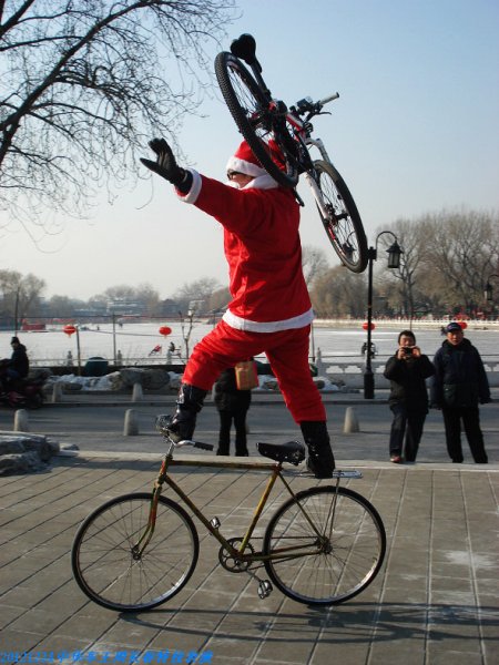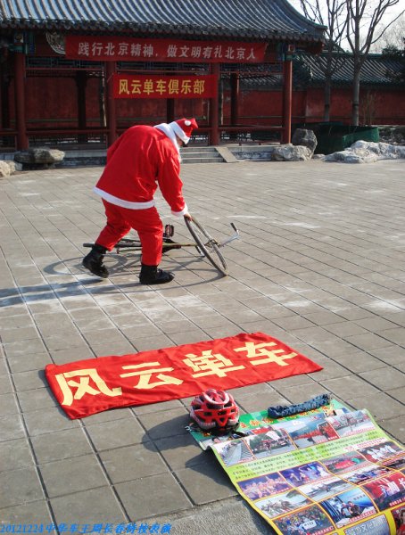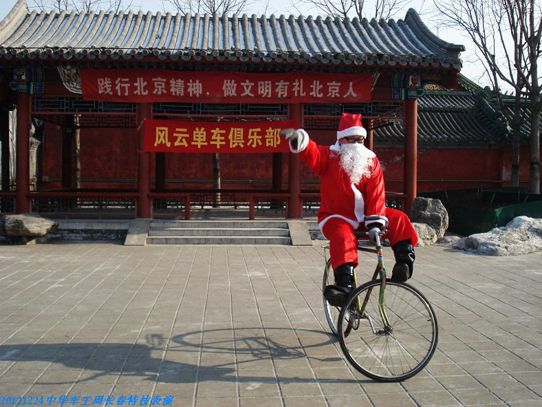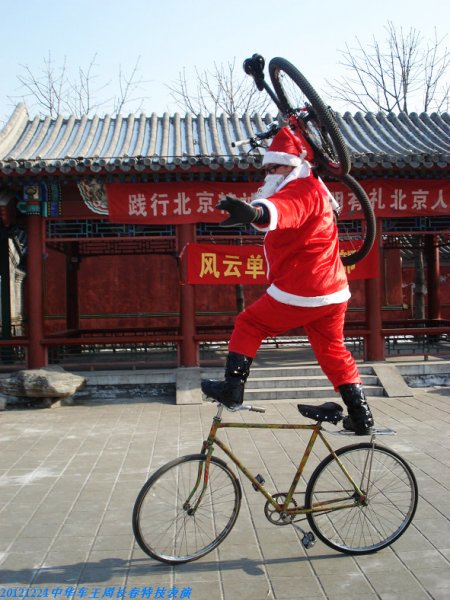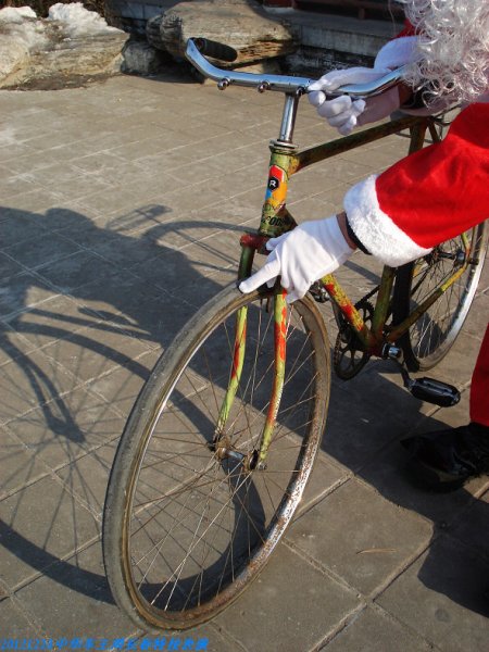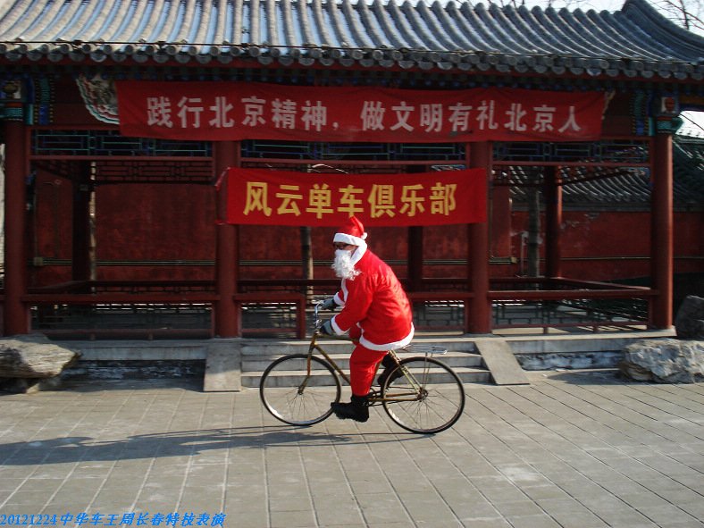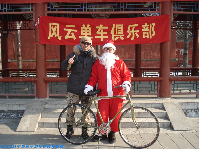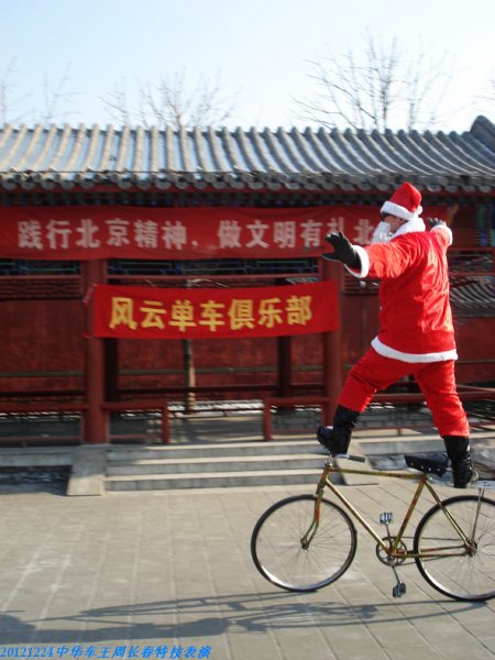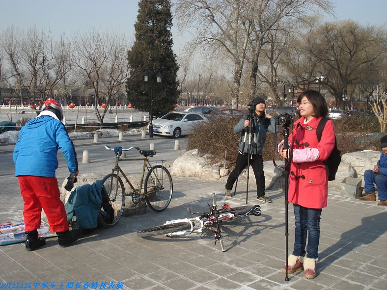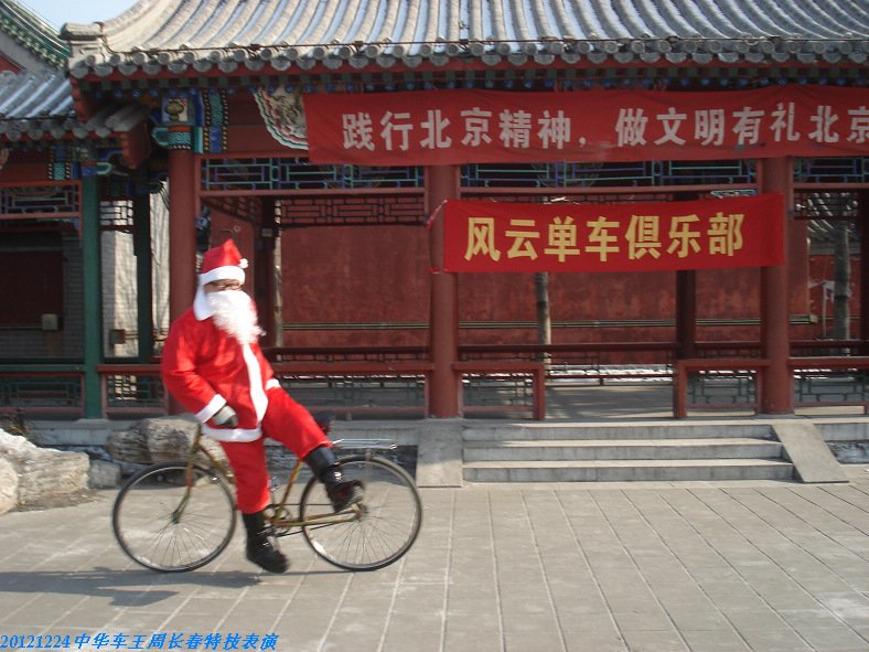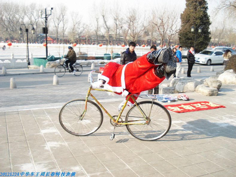 美国有“超人”那是科幻的,中国有“孙悟空”那是神话的,“地球超人”那是艺绝天下的。 第一次见“中华车王”周长春先生,还是在去年文博会风云单车的专场。当时“车王”以一辆没有车闸的普通自行车为道具技惊四座,眼花缭乱的动作看的人目瞪口呆。 今年的文博会风云单车文化展,“车王”又来了。而且带来了他的“2013倒骑车周游世界”的宏伟计划!展会最后一天,“车王”神秘兮兮的拎来一个纸盒,告诉我,这是一套圣诞服——明天,也就是24号中午时分,他要在什刹海冰面表演特技!我当时应允,有时间,届时一定去给“车王”捧场。 24号,据说是30年以来,北京最冷的一天。我提前一小时到达约定地点,带着风云的条幅、袖标,代表风云单车29000注册会员见证“车王”这一历史时刻。 (注:特技表演,非正常骑——专业特技,请勿模仿) ![]() ![]() ![]() ![]() ![]() ![]() ![]() ![]() |
