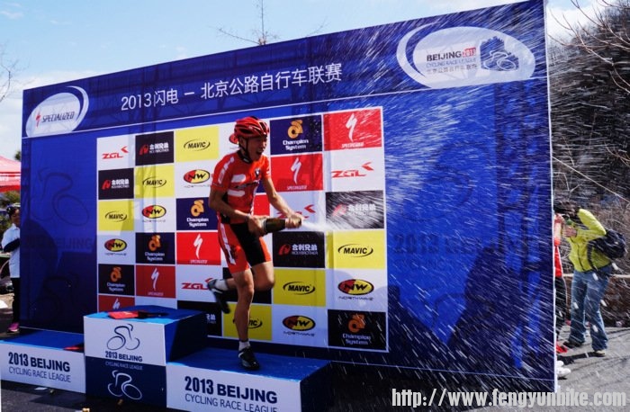 : 2013年4月13日 2013闪电-北京公路联赛第二场——北京门头沟妙峰山爬坡赛 石家庄BH车队的张含夺冠 这是颁奖后冠军张含喷洒香槟欢庆胜利 风云单车记录了这一精彩瞬间 ...