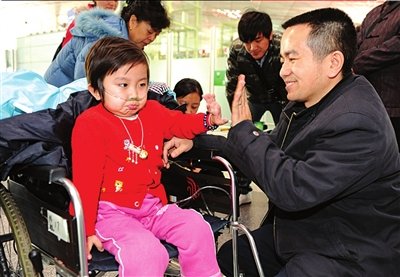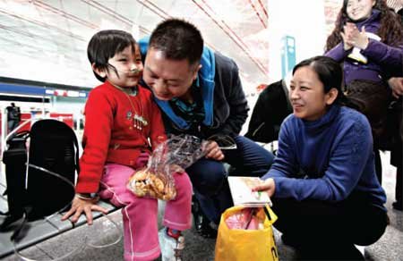 宝贝别哭 爸爸的签证未过,只能在机场与女儿告别。 本报讯 昨天中午,带着爱心人士的祝福,5岁的怡帆终于在妈妈的陪同下,踏上了赴美治疗的旅程。10余名一直为怡帆奔走的志愿者,一同前往机场送别母女。 怡帆从出生第二天起,就发现呼吸系统问题,之后多家医院均未确诊病因。从3岁半起,怡帆的生活就以一台氧气机为轴心,每天只能在3米长的输气管周围挪动。 2010年1月,亚历山大医生从美国带回的血样检测及影像分析结果,确诊怡帆的病症是“肺细胞代谢缺陷”,只能通过全肺移植来救治。 为了募集到高达50万美金的治疗费用,从去年12月至今,众多好心人士开始了爱心接力,为小怡帆募捐更多的救命钱。2月27日,怡帆收到了波士顿儿童医院的邀请函。而同时,所差的治疗费也凑齐了。 昨天上午10点,怡帆戴着便携式吸氧器由妈妈抱着抵达了机场,同行的还有十几名志愿者。更有好心人赶到机场给怡帆送来8775元捐款。知道自己马上要到美国去接受治疗,怡帆懂事地对送行的叔叔阿姨说,“我一定会回来的。”接着,她又贴着爸爸的耳朵说起了悄悄话,“爸爸,我听你的话,我会照顾妈妈的。” 据介绍,母女俩会坐11个小时的飞机到达旧金山,然后转机到波士顿。怡帆将在波士顿儿童医院接受会诊,做进一步的评估,以确定她成为一个移植候选人,进入肺移植等待名单。 |