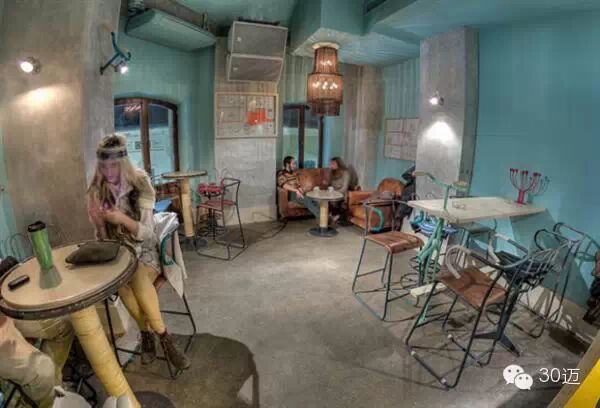这是一个以自行车为主题,搭于自行车之上的咖啡吧,这里面所有的座椅,以及装饰品全是取自于自行车之上,而这些自行车的零部件则来自于所收集的自行车中。