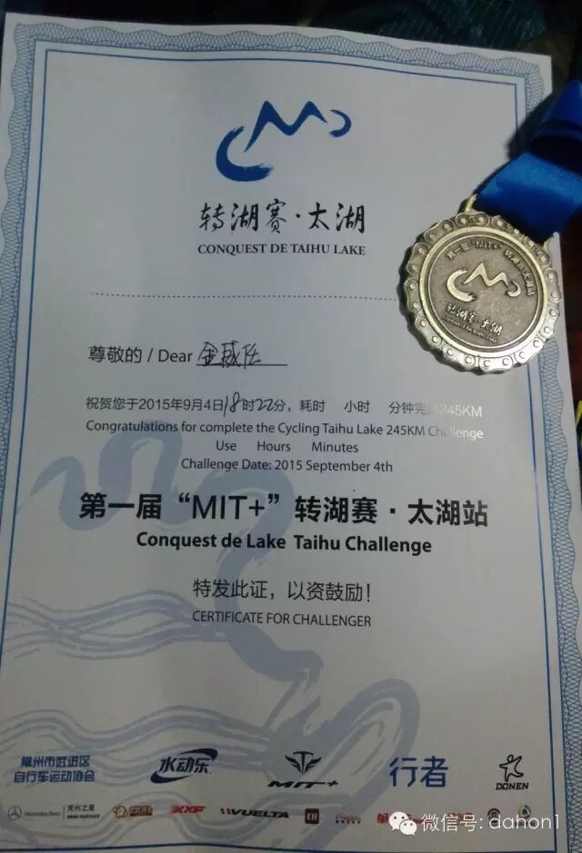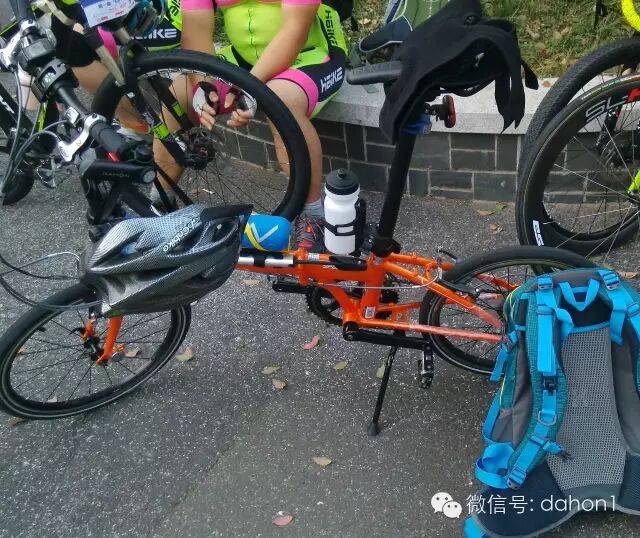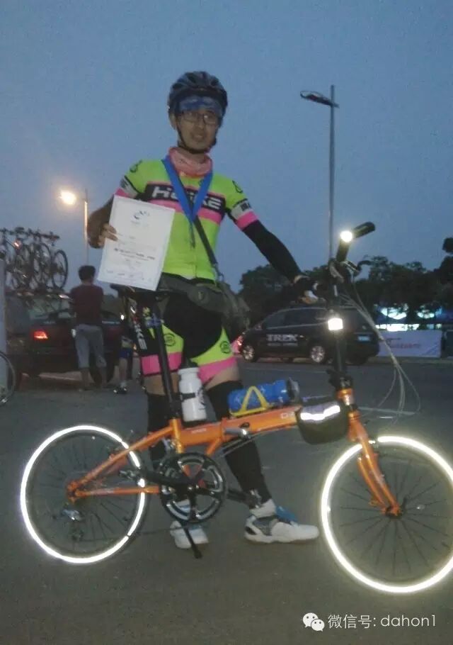 隔壁这位公路的帅哥是帮我们一小队人一路破风到终点的攻城,一路上我也看到好几辆折叠车参加比赛,但都被我一路超越,不仅如此,同样还秒杀了一大波公路车,这感觉相当不错。但也因为一直在赶路,所以拍的照片不是很多。 245公里的路对像我这样的普通人来说绝对是一种考验,一路上都在努力的跟着,上午还好,到了下午人也渐渐疲劳起来,而且中途还走错了路。150公里以后完全是靠着意志力在骑行,中途看到有很多人骑不动直接上了后勤车,但我仍在坚持骑着。最终,经历总共10.5个小时左右的时间,我终于完成了挑战,使自己的日骑行里程又上了一个新台阶。一路上新买没多久的D18表现出色,没有出现什么问题,一直担心的爆胎也没发生,虽然赛前已经买了两条内胎备着了。而当听说我是第二名到达终点的小折时,虽然很累,但还是蛮开心的。而且我一路赶超众多公路,靠着小折顺利完赛。