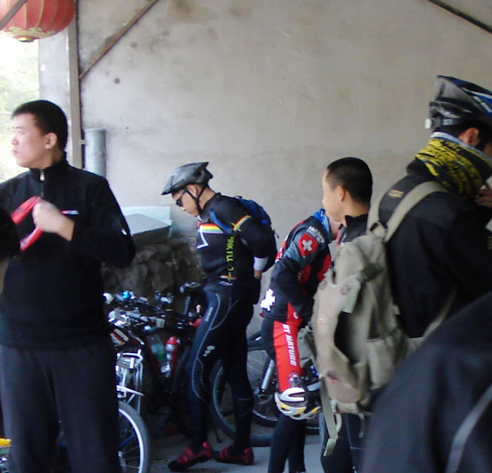 作业写完了,风云也登陆了,水也烧好了,洗澡去,希望能把今天的背运和灰尘一起洗个干净。 借几张同行骑友的照片,先向照相者致敬。穿黑衣背蓝色背包的就是我,去晚了,没赶上牌楼合影,遗憾啊!感谢车友天下独行和寿寿提供我的照片,内牛满面啊!