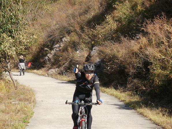 事先约定在三家店六环桥下等豪总和车友,我早晨7点起床,7点45分出发,不到8点来到约定地点,有一公路老哥也在等候,一问,和我不是一码事,人家是海淀车队的,要去灵山,各等各的吧,等待期间给车子补了气,我突然发现车子的前后闸都有些软,决定调一下,这一调不要紧,后闸总是刹车片蹭夹器,怎么也弄不好,就差没把轱辘拆了,折腾了半天,心想先凑合着吧,不行等回头去车行,这时候时间已经到了8点15,眼看着一大队人马从我面前经过,其中倒数第二位的黑像豪总,但是戴着头巾我没敢认,那人也看了我一眼,没说话,我想豪总应该能认出我吧,所以觉得不是,就继续等,一直等到8点40,期间过去N队人,但是都肯定不是豪总,心说坏了,刚才那个一定就是豪总,因为快一个小时了,从首钢东门推也该推过来了。拿出手机想给豪总打电话,一查,没有,因为号码记在另一部手机里了,今天出来带的A81,晕!怎么办,追吧,追不上就自己爬一次妙吧,反正也没爬过。 骑上车一路30像北开去,路上不时超过三三两两的骑行同道,多是些年纪大的和有女同志的,骑不快,不时看着路牌,眼见一辆981临快,跟着它吧,一抬头,到了担礼隧道,过去一看就不对了,忙找人问,人家说你走过了,往回骑,郁闷,掉头再往回,到了岔路口,看清了大牌子,刚才竟顾骑了,没看牌子,真是欲速则不达啊,心想这回没戏了,又耽误了这么长时间。 终于开始一个人的漫长爬坡,早就听说过妙峰山这坡,又臭又长啊,而且没有休息的机会,一路上坡,骑吧,开始坡度不太大的时候还能保持20左右的速度,但是随着坡度的加大,越来越慢,最后就剩下11左右,爬着爬着看见前面两个车友,没在意,超了,然后又看见四五个,最后一个的身影很像豪总,超过去回头一看,果然是豪总!终于让我给追上了,和豪总说明了情况,豪总说早上看见我了,也觉得像我,但是我和一个老头在一起,没敢认,晕啊!豪总今天收尾,让我们有体力的可以先走,我就一路勇往直前,超过了几个车友,感觉这坡真是要命,没有尽头,正上气不接下气的时候,终于看到希望,一群车友在水站补水,我也到水站休息一下吧,一问,原来就是豪总的队伍,说在这里等队员到齐一起上,我终于也能休息一下,一路追过来,真是够呛。 等了半个多小时,人到齐了,豪总说继续出发,我开始骑在中间,发现前面带队骑的老兄节奏和我不符,跟着很累,于是超过去到前面,我前面有个穿白外套的山地小伙,体力很好,节奏和我相当,就跟着他了,一路尾随那小伙,超越了一辆公路,路旁游人不时投来各种各样的眼光,无暇理会,低着头使劲蹬,逐渐汽车越来越多,一抬头,到了!妙峰山售票处!晕,竟然又走错了,一问那小伙,人家是单飞来爬妙的,赶紧放坡往下走,还好,我赶到那个岔路口的时候豪总他们刚刚越过那个障碍,正在往上——推!我说我又走错了,上到妙峰山了,豪总说那一起推吧!我说,您饶了我吧,我这锁鞋,推比骑还累,于是跨上车,用最小的牙盘带4档,爬!这个坡可比刚才到妙峰山的那个更变态,路况不好不说,还有好几处陡坡,咬着牙爬,路上有很多徒步登山的,看到我们骑着上都觉得不可思议,其中还有一些人拿出相机给我们照相,我一般都很配合,摆个胜利的POSE。我从最后一名,逐渐超过一些人,一口气骑到那个大平台,发现自己还算是比较早上来的,休息一下吧,不过上面真冷,风很大,幸好我被天气预报忽悠,说今天只有16度,所以背了一套防风外衣,赶紧穿上,一下就暖和了,在平台上等了半个多小时,豪总带人骑上来了,不过他骗不了我们,我们是眼看着他们推上来的,到最后一个弯道才开始骑的。 等豪总到了平台,说这里不是终点,继续上,我们跟着豪总继续上,不过这时候大家都没力气了,已经快中午1点了,大家都已经饿得前心贴后背了,很多人骑了没几步就开始下来推,我挂着小牙盘慢慢蹬,蹬着蹬着发现不对劲了,前面是乱石路了,我的纯光头可骑不了这样的路,赶紧下车,等推车转过弯,发现这里也是一个平台,只是都是荒草,原来骑行到这里就是终点了,豪总带了几个人又徒步爬到上面一些乱石堆去,我穿着锁鞋,没去凑热闹,大概十几分钟后,豪总下来了,说放坡下山,要求我们不能超过他,他带队,队员排成一字形,不得超车,并且两车必须拉开距离,于是我这次紧跟着豪总,排在第二位,生怕自己再走错了,晕啊。下坡的时候,遇到很多徒步登山的,看到我们一大群人骑着价格不菲的自行车,穿得花花绿绿的,而且秩序井然,都向我们投来羡慕的眼光,其中很多人拿起相机,抓拍下我们放坡的英姿。 一路放坡无话,我因为穿着防风外套,没感觉冷,有些只穿着骑行服的朋友说:都冻僵了。到了桥头堡餐馆,合金已经在这里等候了,不知道什么原因,合金从水站就没再往上爬,和一猫一起先下来了,我们到饭馆马上点餐,14个人,坐了满满一桌,上来的菜基本是没等在桌子上转一圈就没了,估计老板也是见惯了我们这样的恶狼,丝毫不觉的意外,FB每人花了不到20元,吃得不错。 回城还是老规矩,豪总带队,速度20-25,豪总说刚吃完饭,不能巨烈运动,骑到温泉的路口,有几个车友走温泉回去,大家道了别,这时候收尾的合金追上来说后面有位车友有些拉伤,我们要等一下,于是我们在过了六环入口的一块空地上等,豪总说,路很远的可以先走,我说那路很近的呢?豪总说,还真把你忽略了,你离家还多远?我说也就5公里多吧。豪总说那你别等了,先回去吧,路上别太快。我说那好,那你们也多