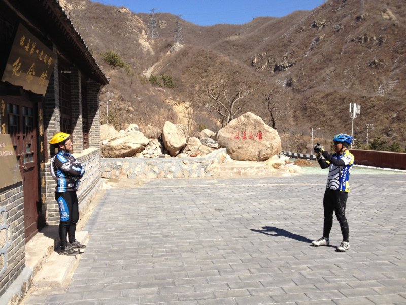 第一次正爬慈悲峪,还是在去年初刚骑车不久,参加欧亚马时尚骑行组织的去黄花城水长城的活动,那时感觉这坡真长、道真陡、路真远、人真累!150多公里,很了不得了!现如今,走得多了,路也熟了,心里有底了自然就不一样了。别的事一般都讲是“无知者无畏”,但我感觉这骑车、爬山不知路是“无知者必畏”!不知啥时到顶的心情,可能很多车友都是体会极深的了!在慈悲峪的垭口,我们还是按驰鹿队的惯例在此照个合影留念,独行的车座脚架利用的越发纯熟,几次合影时都不忘记本职工作拿出咱“风云单车”的红旗入镜展示。