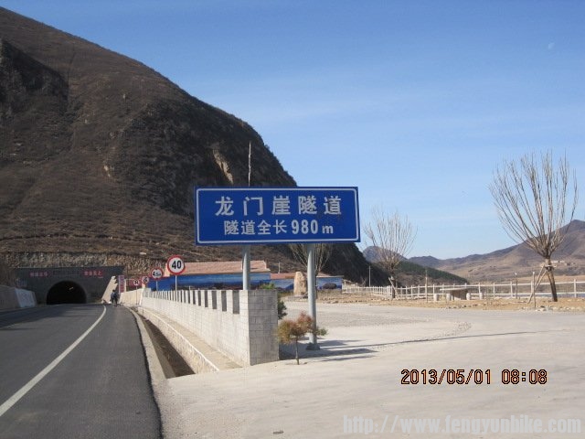 过了这个隧道,就是下坡路的,但下坡并不意味着幸福!下坡那个冷啊,下一段停一段,跺跺脚,哈哈手,也难怪,路旁的小河,河中间虽然有水在流淌着,但两旁的河床上仍然是厚厚的冰块。这里和北京真是不一样啊。
