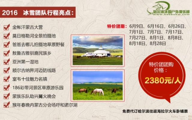 特价期:2016年 06月 26日 哈尔滨/海拉尔集合 —— 07月 01日 海拉尔结束(2380元/人)