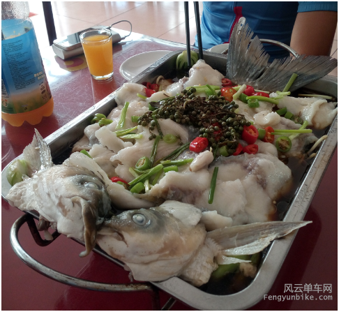 推车的三位老汉,胆战心惊的放坡收编了独自玩耍的小崔黑妞,于进山路口农家院用餐,这个汆鱼很好吃,狂推荐