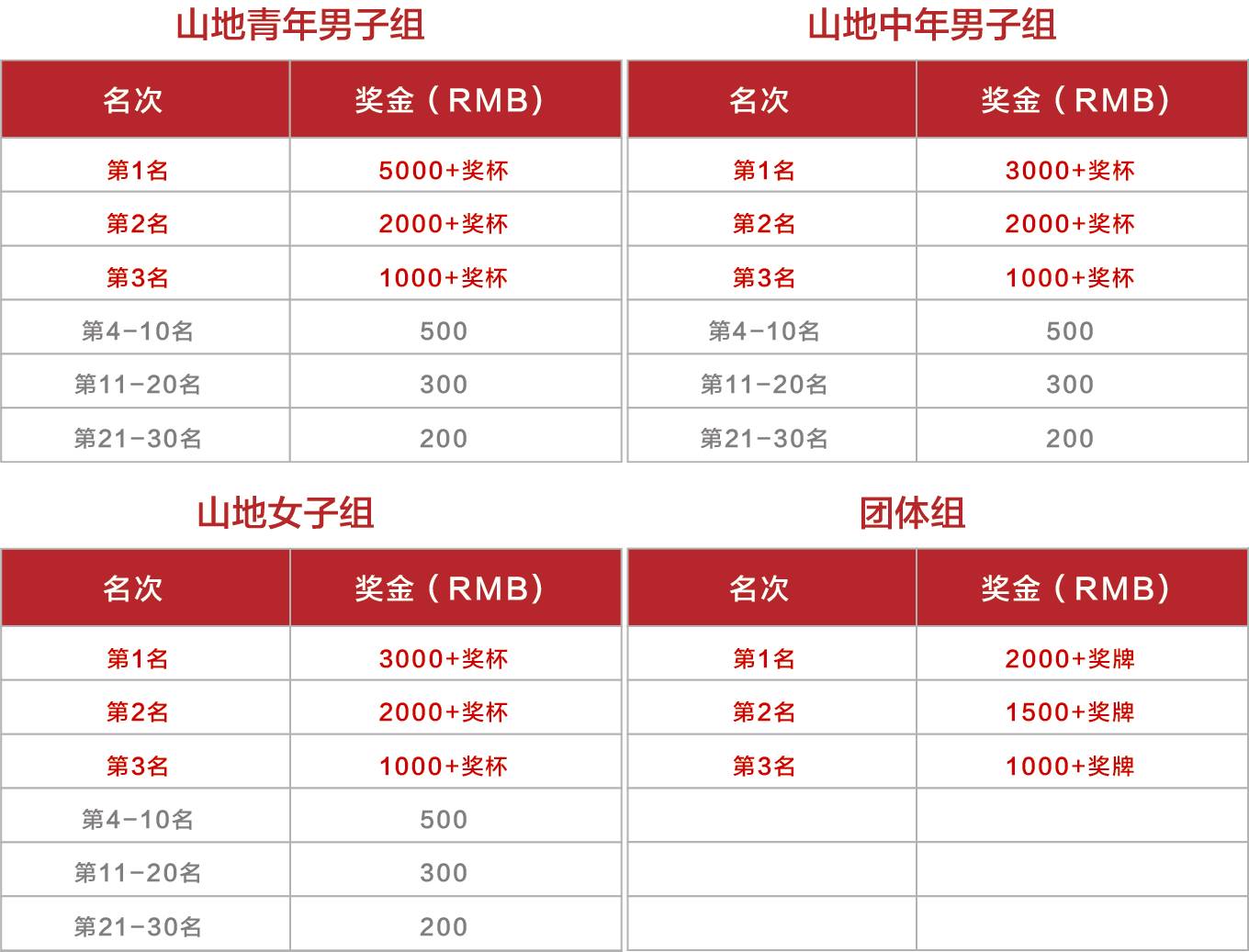 团体奖奖励办法:俱乐部或车店报名选手,男子取前三名最好成绩、女子取前两名最好成绩相加,用时最短的为团体第一名,以此类推。