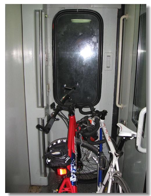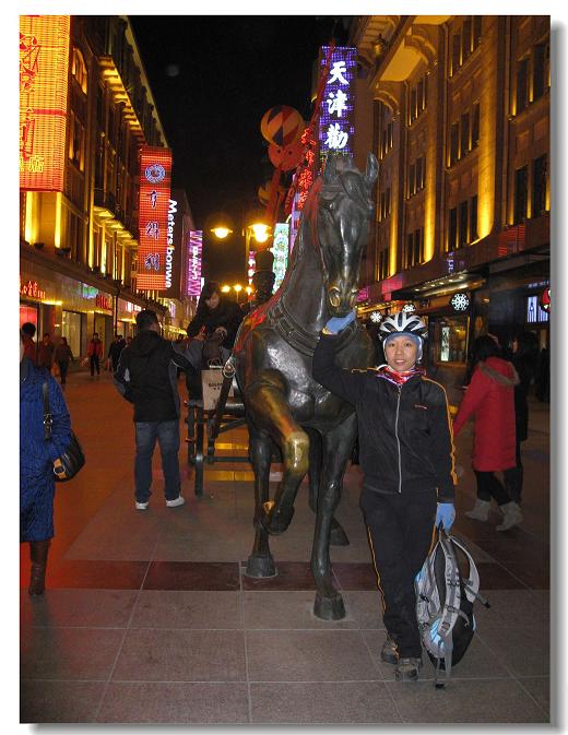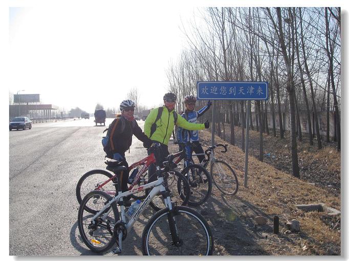 13:15路标显示距离市中心19公里,从这里开始,我们兴奋了,SUKULA高喊着“包子,麻花我们来了”奔向前方,可惜好景不长,路开始偏离,地图更是对不上,路标也没了。一年中最浩大的问路工程开始了,从随机性问一个人,到后来为提高正确率逢人就问,因为每个路人最后的结束语都是你到那边再问问吧!说多了你也不清楚。看着日渐偏西的太阳,骑回去的可能性为零了,因为实在没胆量顶着黑夜骑行在没有路灯的103国道上。当我们看到标有天津站的路标时,我们的问路工程才暂告一个段落。到天津站时已至下午四点。这才发现腹中早已空空。四人不甘心只吃车站附近的快餐,我们要吃肉,大块大块的肉。于是四只饿狼开始四处觅食,当狗不理酒店出现在我们眼前时,尽管热情的天津大爷大妈告知我们这不是正宗的,正宗的在……四人不管正不正宗了,继续绕街玩的事是不想再干了,关键是我怕再绕下去我们又绕不回火车站了,饭毕,四人捧着饱腹回到火车站,本来还想着要不要办托运,售票厅的警察叔叔告诉我上车没事但不知下车如何,真是定心丸呀!于是买票,照相,看车,逛街,一切安排妥当,我和小豆也没心情逛街,完成采买任务就回到车站,这时大家只有一个想法就是安全到家,天津站前的夜景很美,有点象迷你版的上海外滩,四人在车站前留了影,进站了,我们推着车顶着乘客好奇的眼光陆续通过安检口、检票口上了车,我们回家了,一天的疲劳尽失,SUKULA照例当着开心果,吸引众人眼球。疲劳的小豆也终于因为好帅SUKULA的逗贫和我们如此拉风的上了火车而开心的笑了,这个坚强的女生终于挺过来了。当时心里想着问豪大妈要面风云的大旗,以后出来就竖在车前,是不是更招眼了,哈哈!10:30我们出了北京站,站前照例留影。好帅送小豆往西,我和SUKULA往东,国贸分手,看着手机上N个弟弟打来的未接来电,他已然不相信我会打车回家,要由出租车司机接电话他才会相信,惭愧呀!弟弟想出这招防止被我忽攸。今天总遇到好人,热情的指路人、天津站售票厅警察、安检口帅哥、检票口美女、列车长、列车员都那样的平易近人,为我们提供方便,就连北京夜晚的出租车司机也热情的帮我拆车装车,这也许才是今天北京天津之行的真正收获吧!回到家中,一切安好!这个周六,天很冷 ,但心很暖。