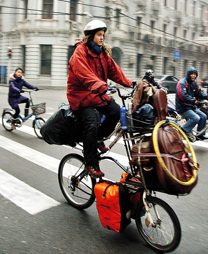 昨天,在四川中路九江路路口,一位市民正好奇地看着骑着双层自行车的旅行者。这群旅行者来自一个叫做“2wheels 4change”的团体,14年前由一群艺术家在德国成立。他们将全部家当都带在经过改装的双层自行车上。本次旅程他们从俄罗斯出发,途经蒙古、日本,在中国短暂停留之后将前往终点站越南。