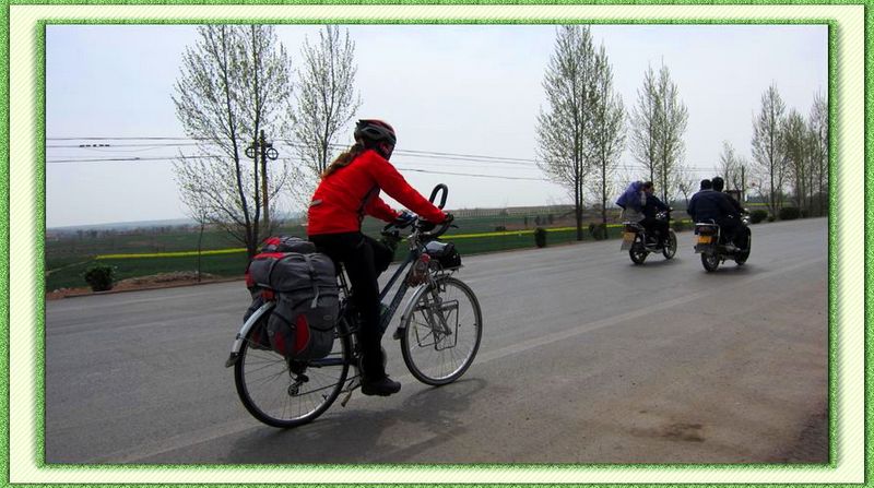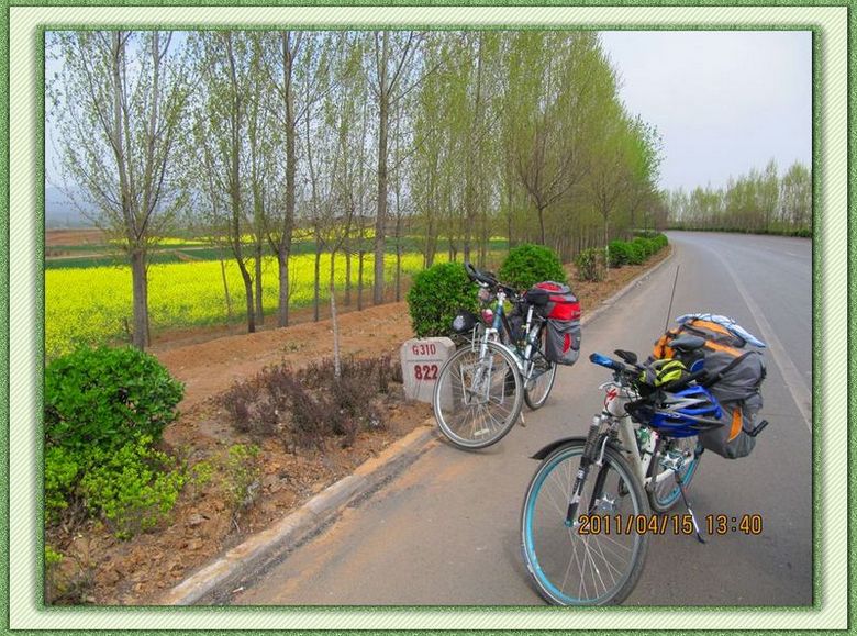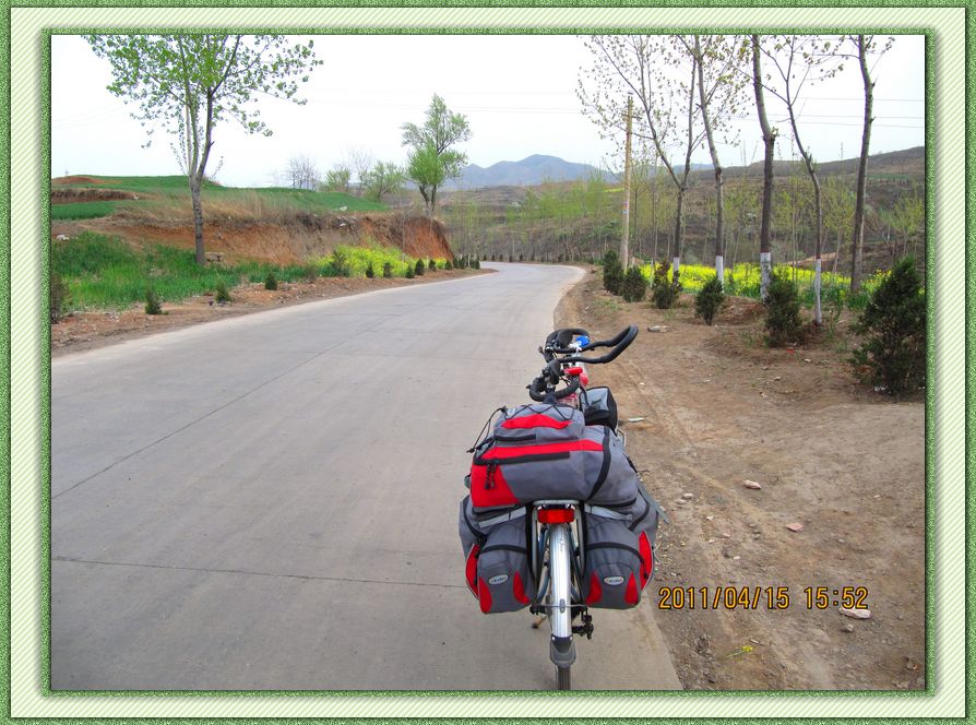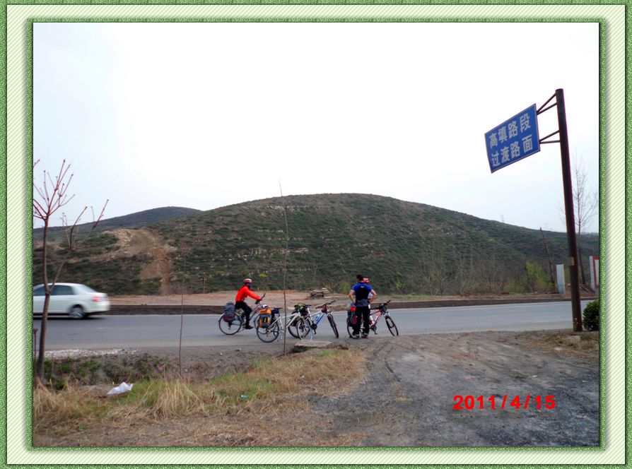 出渑池就是一个大上坡,怪不得让小鸟向回骑吃饭他不干呢。接着就是几个连续较大的起伏路。一共63公里到三门峡,风景开始变得很美,从这时候我知道了看风景是付出代价的,比如:爬坡、爬山,无限风光在险峰嘛。我们一到下午太阳就开始直晒,向西骑,没有办法,一路根本找不到阴凉,太阳晒的热、自身爬大坡累的流汗、大汽车从身边慢慢爬坡开过去的热浪混合在一起,就想找个卖冰棍吃,找冰水喝、找水池泡脚。。。结果是什么都没有。穿一件长袖衣服全部湿透,早上和晚上冷,所以没有穿短袖。