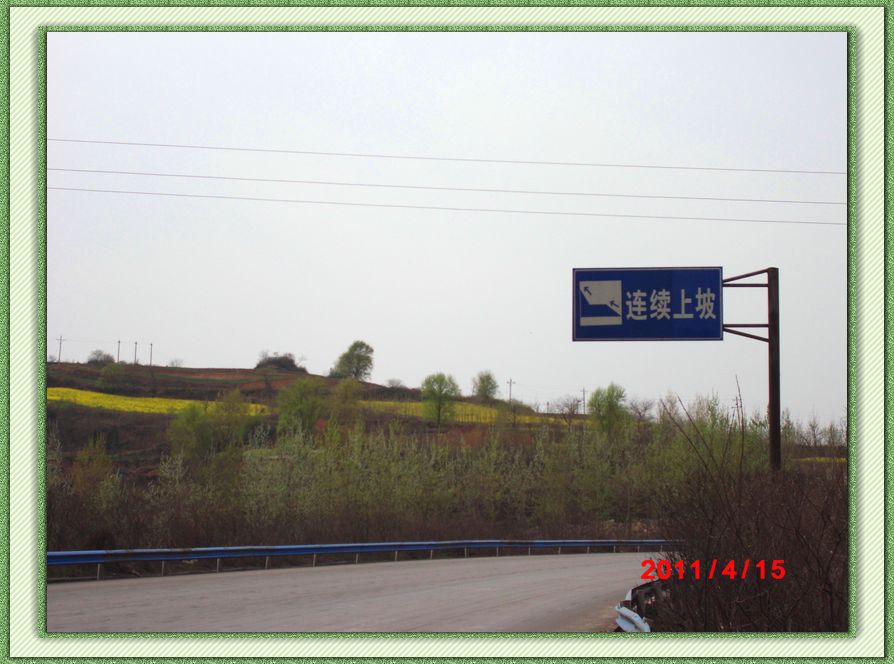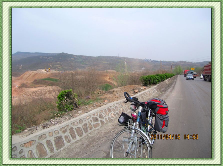 我这一路,什么时候是上坡没有记住,爬坡爬到顶部什么时候开始下坡记住了。一路的起伏路啊。记得爬坡到了G310国道第844公里处开始放坡,爽,放多少公里也没有记住。又记得爬坡到G310国道第851公里时再继续爬坡200米就开始放坡了。更爽,一直放坡20公里到三门峡。