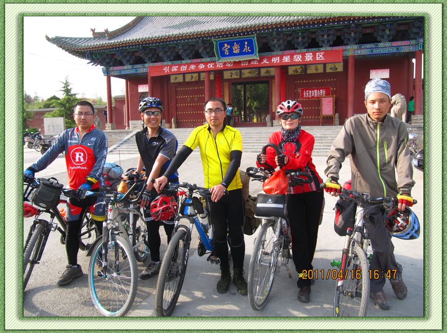 从风陵渡到华阴一路虽然不好走,但是没有任何起伏路了。过了风陵渡不远有个村子我们吃饭休息。然后在骑行的路上欣赏了黄河、渭河、洛河三河并流的风景。我认为黄河不好看,水太浑浊、太黄了。快到华阴时就看到了路南边(左手边)雄伟的山脉了。打听这是什么山?有告诉我们说:是华山。还有告诉我们说:是秦岭。一路翻大涧就给我们累的够呛,这个雄伟的大山是秦岭?uu听说是秦岭掉过车头说:咱们回去吧(其实他在和我们开玩笑)。翻秦岭本来就是我们心中的第一座大山。事实是:华山属于秦岭山脉,是秦岭的一部分。