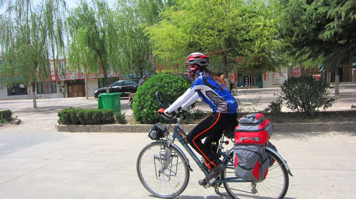 照片描述:在风陵渡小镇骑行。最欣赏我那根头顶上的鸟毛。