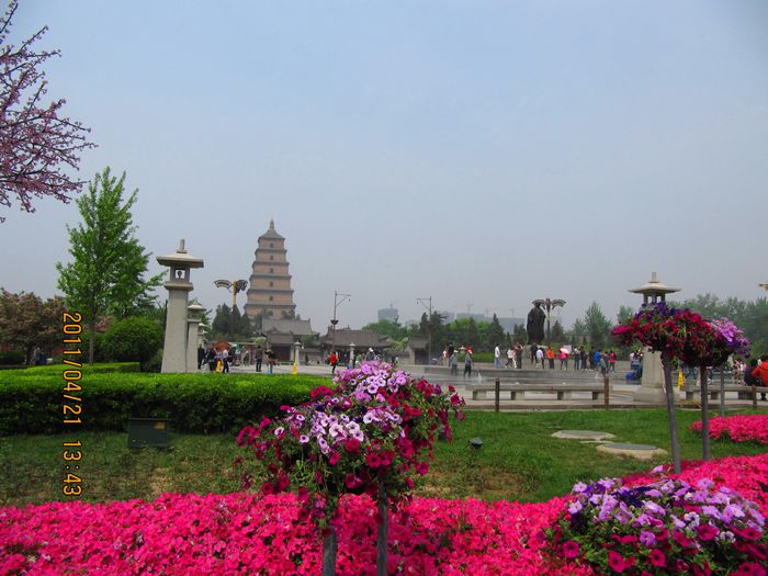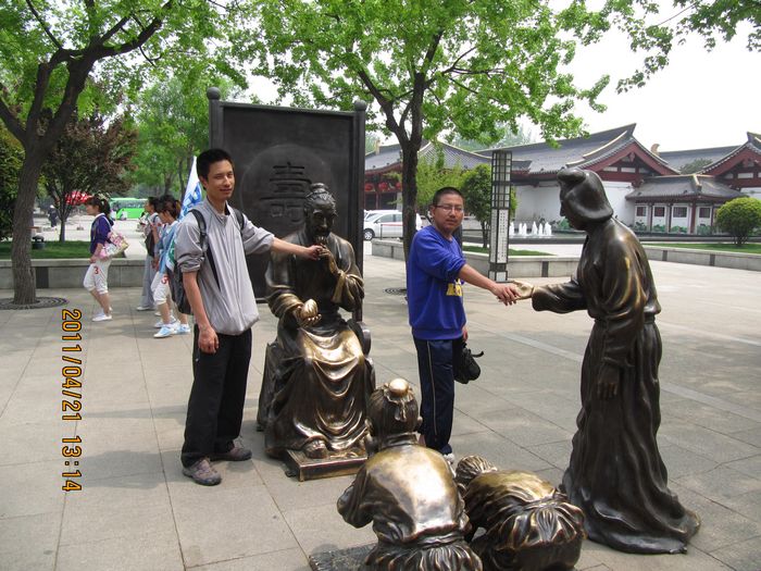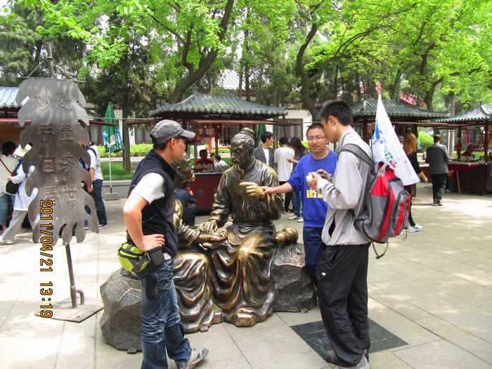 照片描述:队友和大雁塔周围的雕塑共聊。