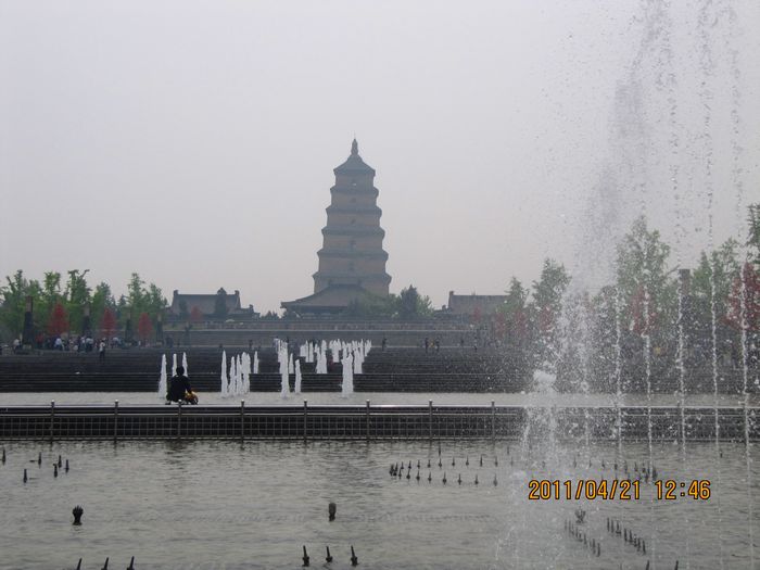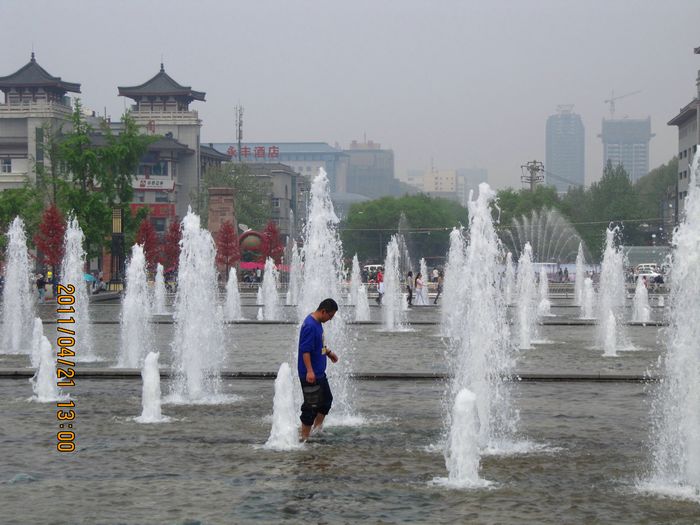 照片描述:大雁塔前面的喷水广场。队友小虎在嬉戏玩水。