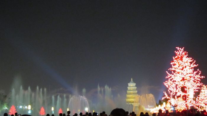 照片描述:夜晚大雁塔音乐喷泉广场。