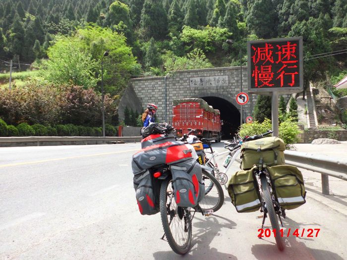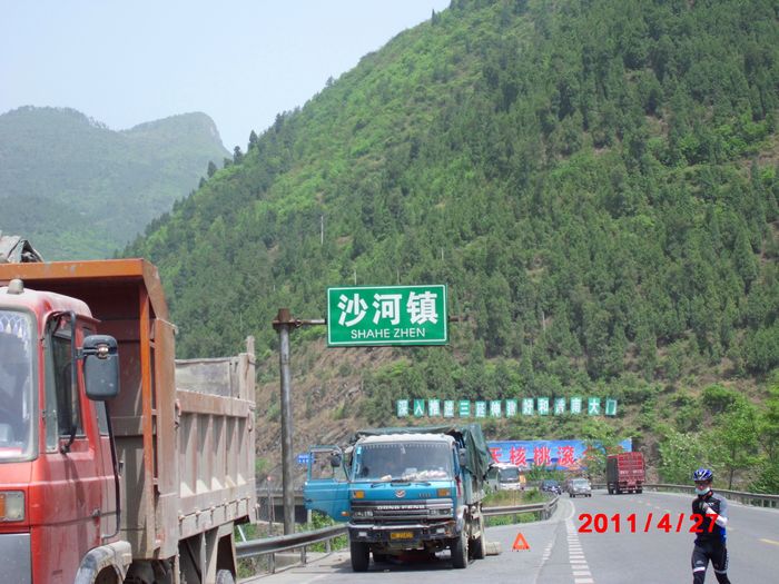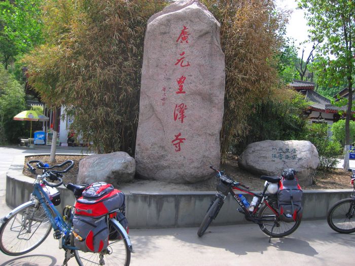 过了四川界我们开始上了川北高速公路了,这里川北高速和G108国道是一个车道。一路风景独好,就是不见什么村镇,高速公路在我们的脚下,穿越隧道已经是我们的家常便饭了,这回我的强光手电立下功劳了。我开始以为过了四川界就爬山什么的,其实基本是在半山腰上骑行,还有点小下坡。看着周围层峦叠嶂翠绿的山峰,看着脚下笔直的高速公路在两架山之间链接,看着我们骑行的路边开着不知名的各种颜色的花朵,觉得四川很美,骑行是一种享受。中午到了,吃饭的地方真的没有,如果继续走高速我们会连渴带饿。我们在沙河镇前面一个好像叫磁瓦窑什么的地方离开高速下道进入小镇吃饭。吃饭前吃根冰棍是必须的。饭馆的老板是个中年小伙子,浓重的四川音听到了。一说起广元好像如数家珍,看样子他熟悉的不得了,经他一说,好像我们是开车似地,不费劲到达他所说的这些。这时候都下午了,他说:你们先去“皇泽寺”,地处广元西郊嘉陵江畔,那里是因武则天当了皇帝又生于广元,所以把原来的“川主庙”改为“皇泽寺”。看完皇泽寺你们再去昭化古城,你们不用去剑阁了,一会儿就到了昭化古城。我问:离昭化古城还有多远?他说:也就40多公里,那还得从广元市区说起。这里距离广元市区很近了。我反正是经不住别人的说教,我们那些小孩们更是不知道如何是好。我的宗旨是:第一听人劝吃饱饭,第二听地头蛇的。吃完饭从小镇按着店老板指的路出发去广元。一路平路再钻个隧道就来到了广元,我们先去广元火车站找个邮局盖戳留念,顺便到邮局把托包里没用的垃圾寄回北京,秦岭已过包里的棉袄和厚衣服、秋衣秋裤等一概寄回,因为这几天白天已经连续30多度的高温了,根本穿不上了,我们是越走越热了。从邮局出来一路打听“皇泽寺”,没有多远就到了。门票:15元,由于天气太热,接下来还有40多公里的路程到昭化古城,我们大家只是在“皇泽寺”门口吃吃根冰棍喝喝水稍休息片刻就出发了。