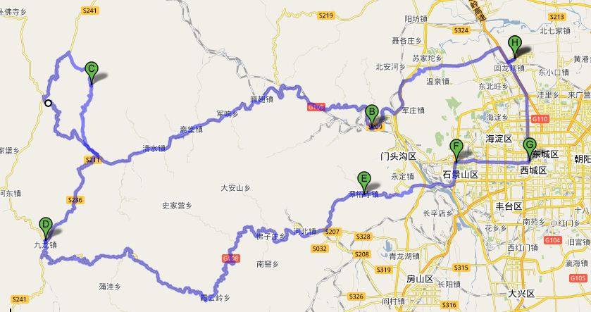 上次去妙峰山的时候,看到路标有“灵山”,回去上网查了一下,灵山是北京海拔最高的山(海拔2302米)。这周末看了一下坛子里的活动,发现没有特别想去的,于是开始自己找路线,决定找一个从未走过的单日单飞。于是选择了如下路线,经Google地图测量大概360KM: 回龙观——军庄阵——妙峰山——雁翅镇——军饷乡——斋堂镇——清水——张家庄——小龙门——孔涧——观音殿——田家沟——苇子村——灵山(C点)——张家庄——九龙镇——霞云岭——河北镇——潭柘寺——回龙观
