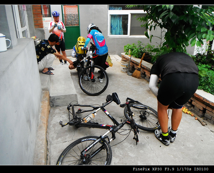 我劝他还是回家了,先搞车搞好了来——他车的架子小了,座管也不够高,已经到安全线了。