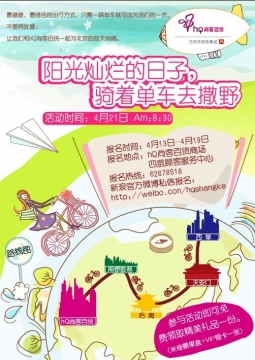 主题:阳光灿烂的日子,骑着单车去撒野 活动时间:4月21日 AM:8:30 最健康,最绿色的出行方式,只需一辆单车就可成为我们的一员。 不要再犹豫,让我们和hQ尚客百货一起为北京的蓝天呐喊。 (1)8:30选手签到,每人发放丝带一条,hQ尚客骑行一张,hQ尚客骑行旗帜一面 (2)9:00准时出发 (3)9:30到达什刹海,绕什刹海半圈。 (4)9:45到达南锣鼓巷,由北口进入。 (5)10:15到达天安门,在天安门广场集合,以天安门为背景拍照合影 (6)11:00到达西单文化广场,开展“新一代主题快闪” (7)12:00返回到尚客北门广场合影发放纪念品,活动结束。 报名时间:4月13日-4月19日 报名地点:hQ尚客百货商场四层顾客服务中心 报名热线:62678518 新浪官方微博私信报名:http://weibo.con/hqshangke