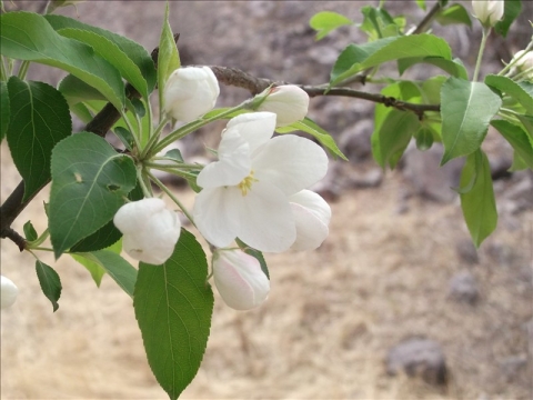 无尽的坡,终于拐过一个弯以后,一道亮丽的风景闪现在我眼前。周围都是灰黄的山坡,唯独那一簇簇洁白在烈日下竟是那样的耀眼!啊,我的海棠!正开得灿烂!!