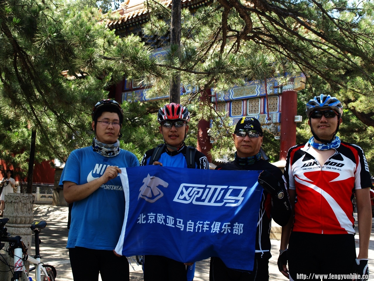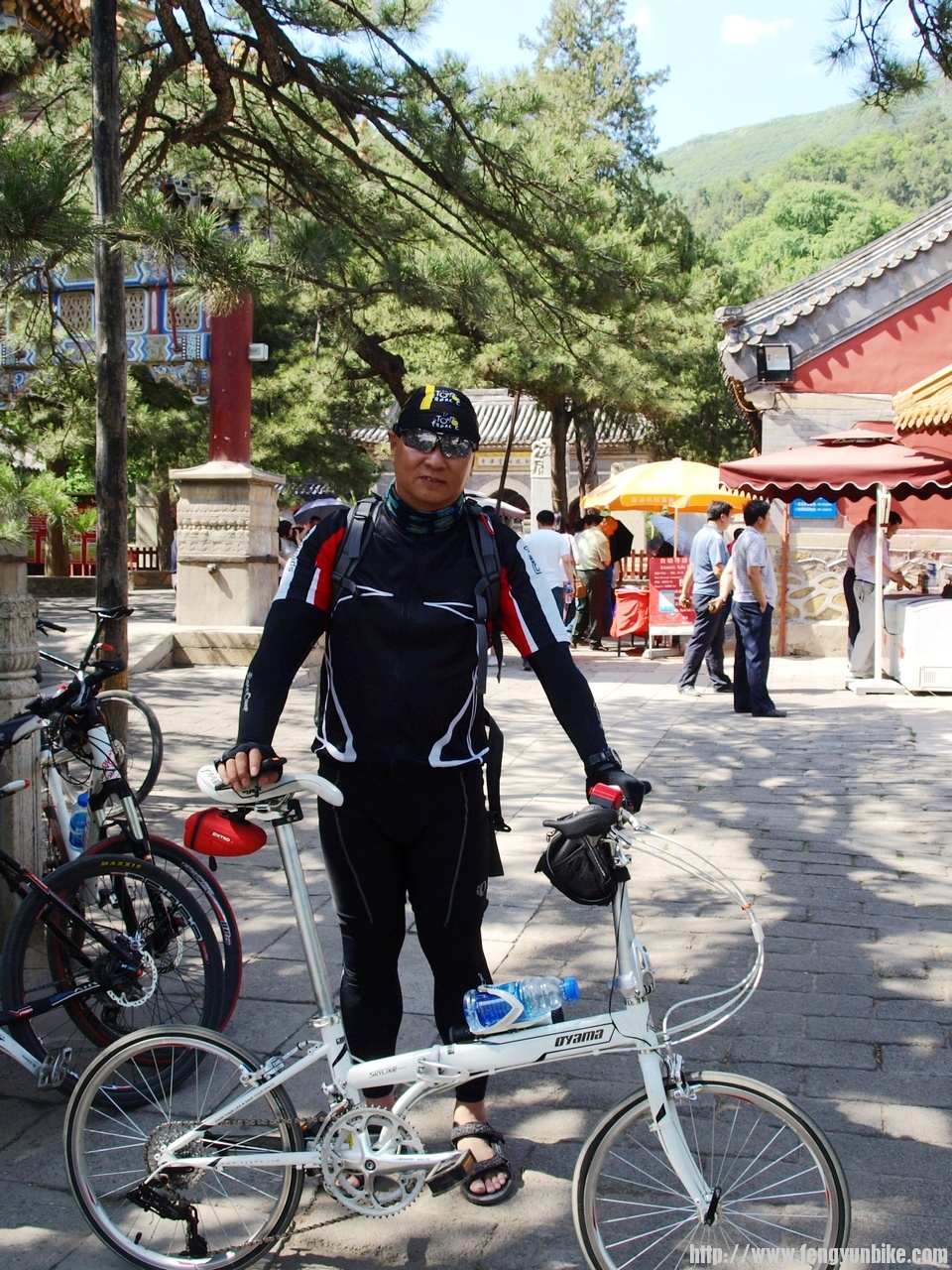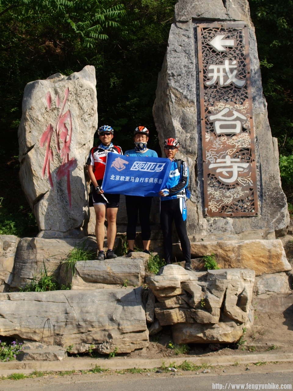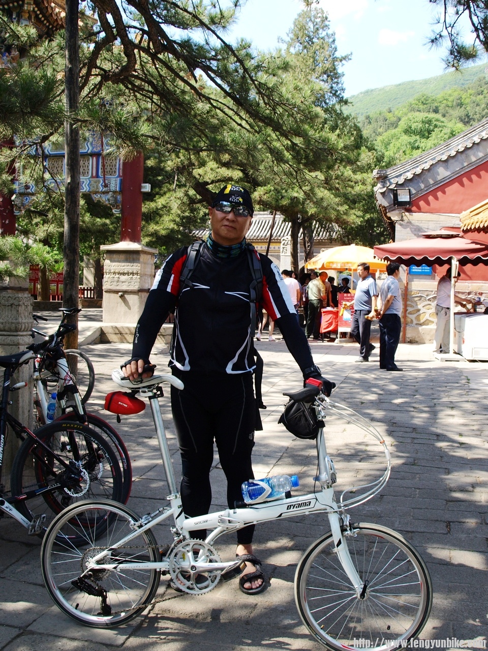 今天老马的人品爆发了, 还没到妙峰山, 后胎就爆了...没辙, 换胎吧, 本来想快速骑到坦礼的, 结果还迟到了半小时{:soso_e113:}, 收上逍遥, 出发前往下苇甸超市补水, 超市门口我看到一哥们一直搬着他的车, 都是人骑车, 怎么这会车骑人了, 仔细一看, 链条断了, 刚好身边有工具, 我们几个人七手八脚截链子接链子, 帮人家搞定了~ 不过这两次的耽搁, 使得我们的出发时间严重的滞后, 到达谭王路的时候已经11点40分了, 大中午爬这个完全没有树荫的路...实在有点自虐...但是既然来了, 那就爬吧...幸好, 今天有风, 而且山上的能见度很好, 天气也还算不错, 一路的风景看着还可以, 由于之前平路骑的太猛, 爬坡的时候大家都没什么状态...骑的很慢, 溜溜达达, 晒着太阳, 蔫了吧唧, 晃晃悠悠的到达了坡顶, 废话少说, 放坡吃饭! 逍遥充分发挥了0.1吨车队队员的天然优势, 以平均时速40+的速度放下去了, 一会就没影了...我们从潭拓寺镇放下去的, 到了分叉口才知道原来已经过了潭拓寺...因为没去过, 所以还是再爬一次吧...呼呼哧哧, 终于爬到了潭拓寺牌坊处, 休息的时候看到一辆欧亚马的小折停在那里, 旁边一位大哥就是车主, 上去攀谈, 原来还是欧亚马车队的元老级人物~呵呵合影留念, 大哥给介绍了一家烧饼夹肉店, 饥肠辘辘的我们赶紧冲去吃饭, 炒饼夹肘子, 拍个黄瓜, 一盘煮花生, 小米绿豆稀饭, 按照风云的严格要求, 虽然很热, 没人要酒, 吃完饭, 放坡回家, 戒台寺留个影, 定慧桥解散~