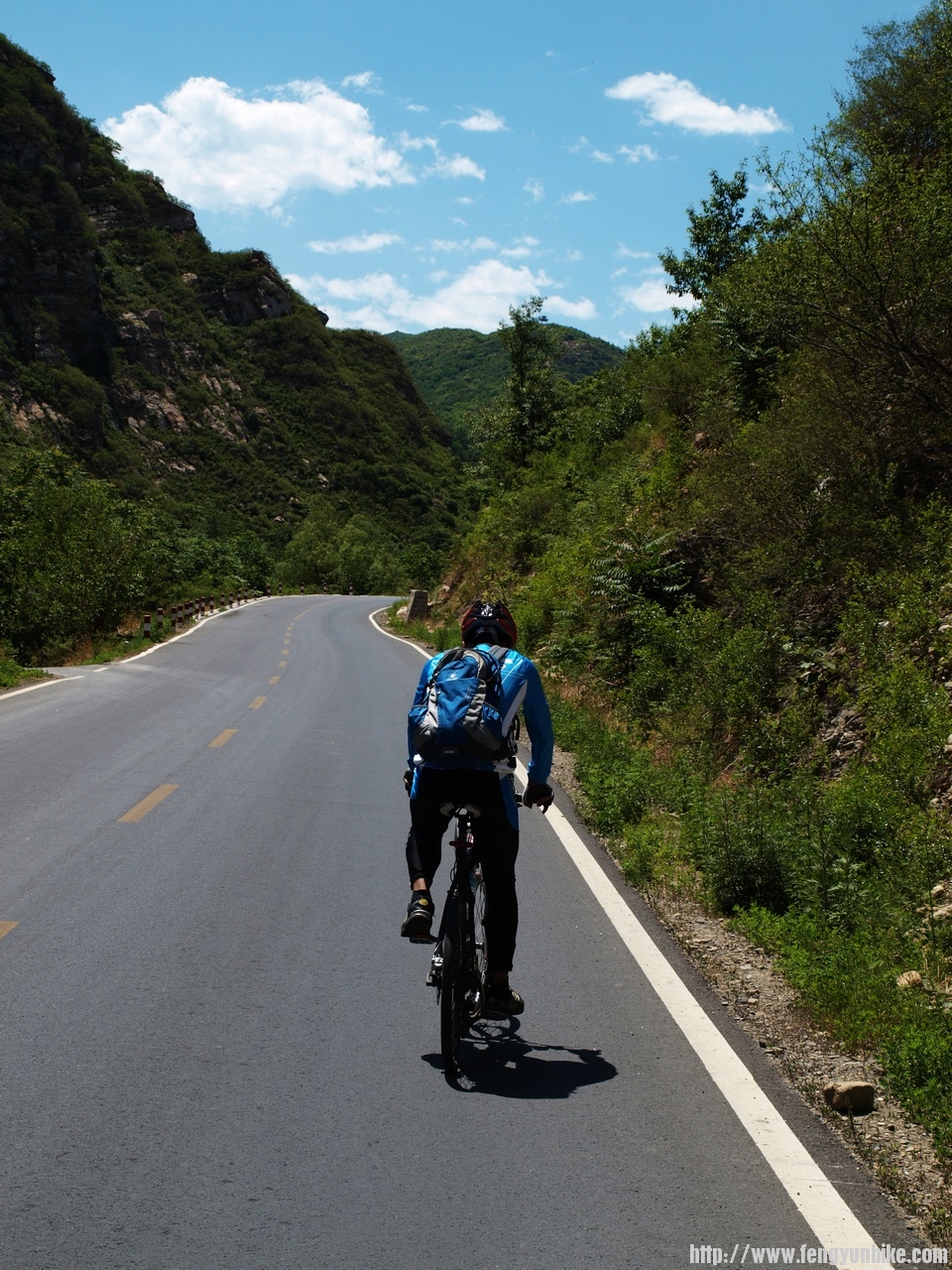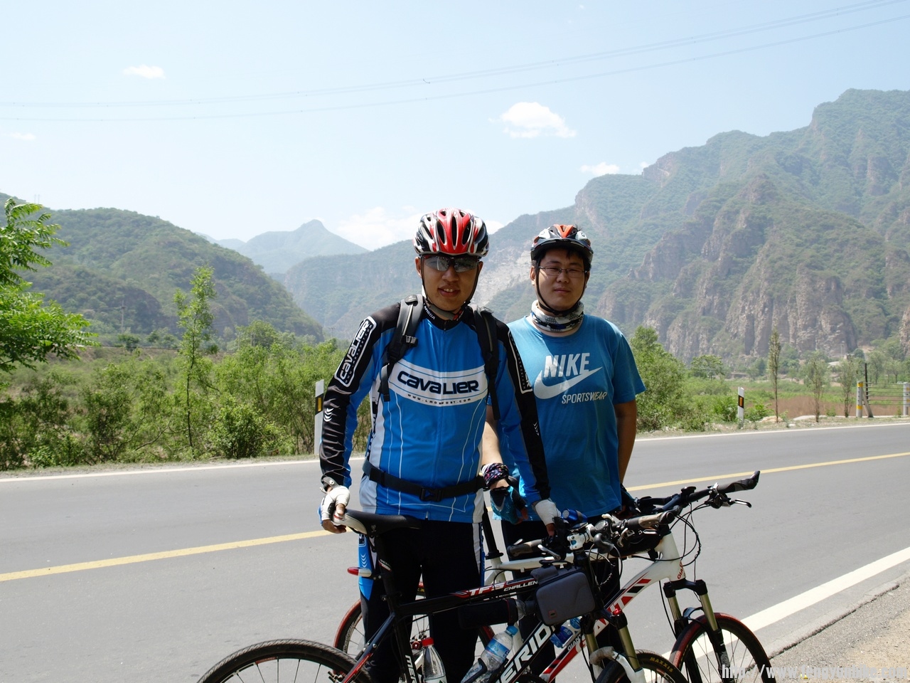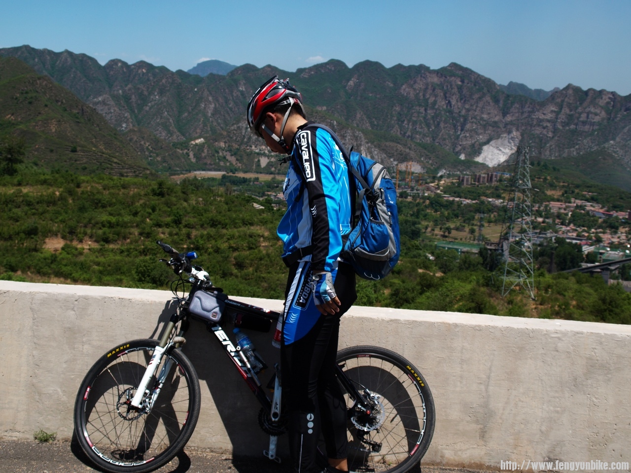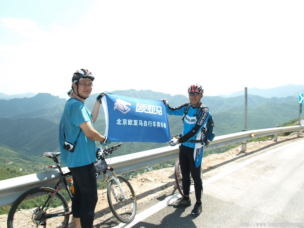 今天老马的人品爆发了, 还没到妙峰山, 后胎就爆了...没辙, 换胎吧, 本来想快速骑到坦礼的, 结果还迟到了半小时{:soso_e113:}, 收上逍遥, 出发前往下苇甸超市补水, 超市门口我看到一哥们一直搬着他的车, 都是人骑车, 怎么这会车骑人了, 仔细一看, 链条断了, 刚好身边有工具, 我们几个人七手八脚截链子接链子, 帮人家搞定了~ 不过这两次的耽搁, 使得我们的出发时间严重的滞后, 到达谭王路的时候已经11点40分了, 大中午爬这个完全没有树荫的路...实在有点自虐...但是既然来了, 那就爬吧...幸好, 今天有风, 而且山上的能见度很好, 天气也还算不错, 一路的风景看着还可以, 由于之前平路骑的太猛, 爬坡的时候大家都没什么状态...骑的很慢, 溜溜达达, 晒着太阳, 蔫了吧唧, 晃晃悠悠的到达了坡顶, 废话少说, 放坡吃饭! 逍遥充分发挥了0.1吨车队队员的天然优势, 以平均时速40+的速度放下去了, 一会就没影了...我们从潭拓寺镇放下去的, 到了分叉口才知道原来已经过了潭拓寺...因为没去过, 所以还是再爬一次吧...呼呼哧哧, 终于爬到了潭拓寺牌坊处, 休息的时候看到一辆欧亚马的小折停在那里, 旁边一位大哥就是车主, 上去攀谈, 原来还是欧亚马车队的元老级人物~呵呵合影留念, 大哥给介绍了一家烧饼夹肉店, 饥肠辘辘的我们赶紧冲去吃饭, 炒饼夹肘子, 拍个黄瓜, 一盘煮花生, 小米绿豆稀饭, 按照风云的严格要求, 虽然很热, 没人要酒, 吃完饭, 放坡回家, 戒台寺留个影, 定慧桥解散~