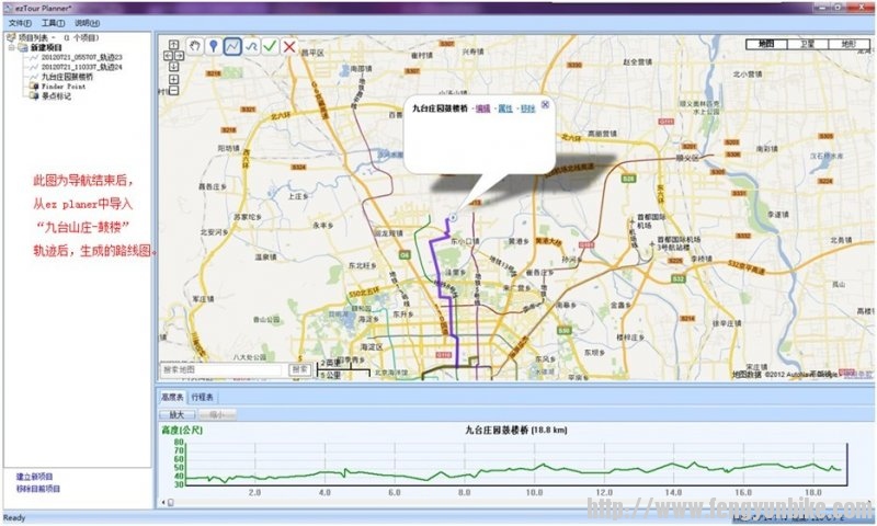 下面以“九台山庄—鼓楼桥”导航体验。先上一张根据通过轨迹导入,导入ez plus软件中,生成的路线和高度图: