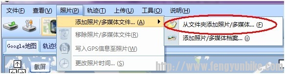 u在“九台山庄-鼓楼桥”轨迹中,加入路上拍摄的沿线照片:打开ezTour Plus,选择“照片”—“添加照片/多媒体文件…”—“从文件夹添加照片/多媒体… ”: