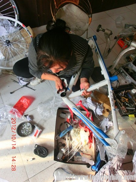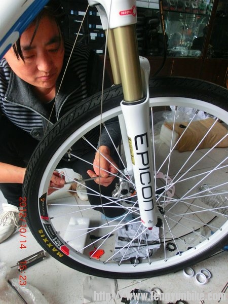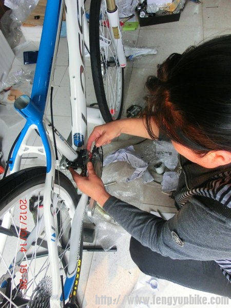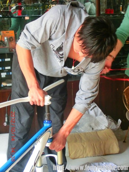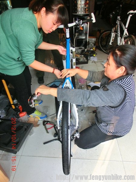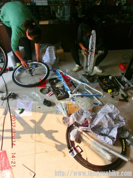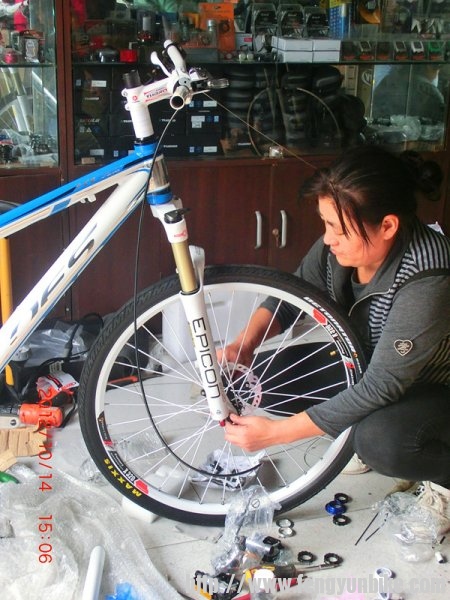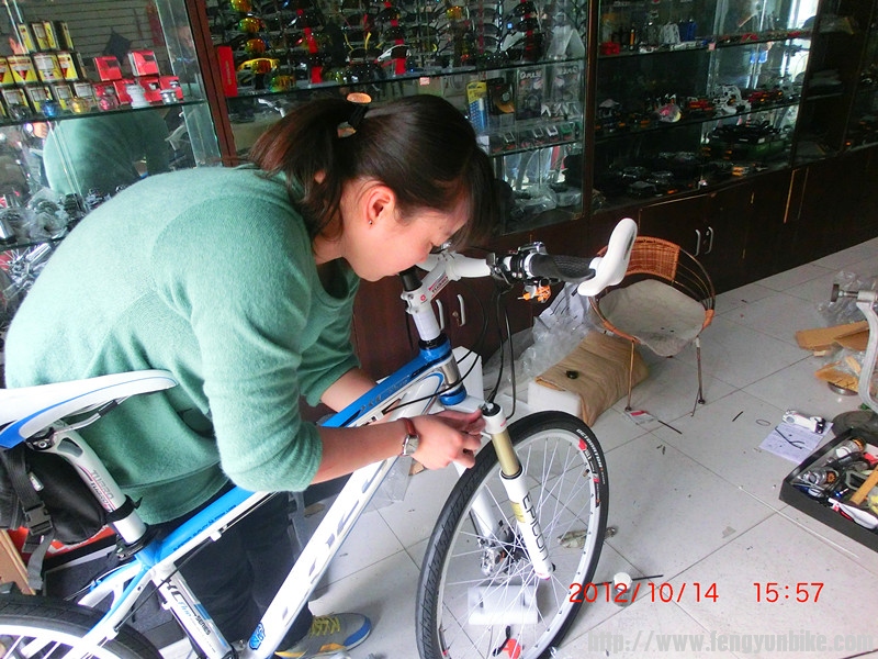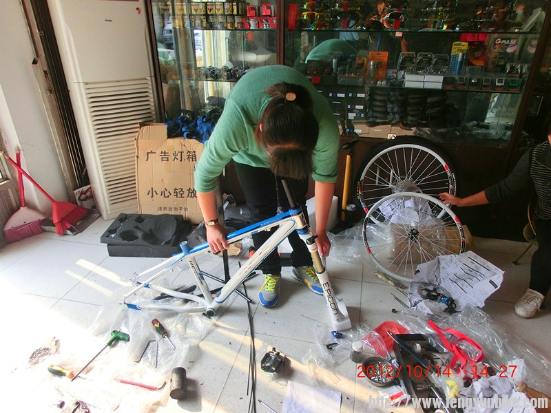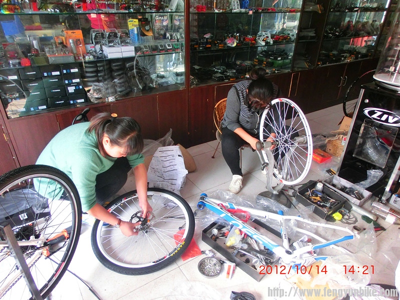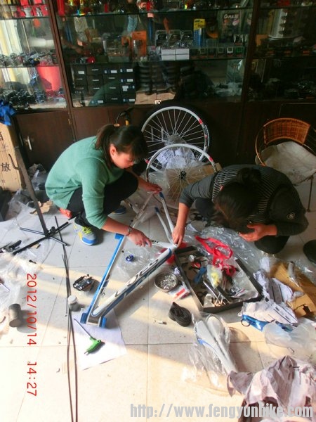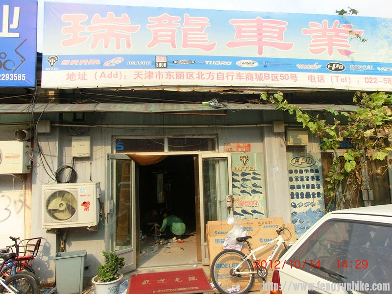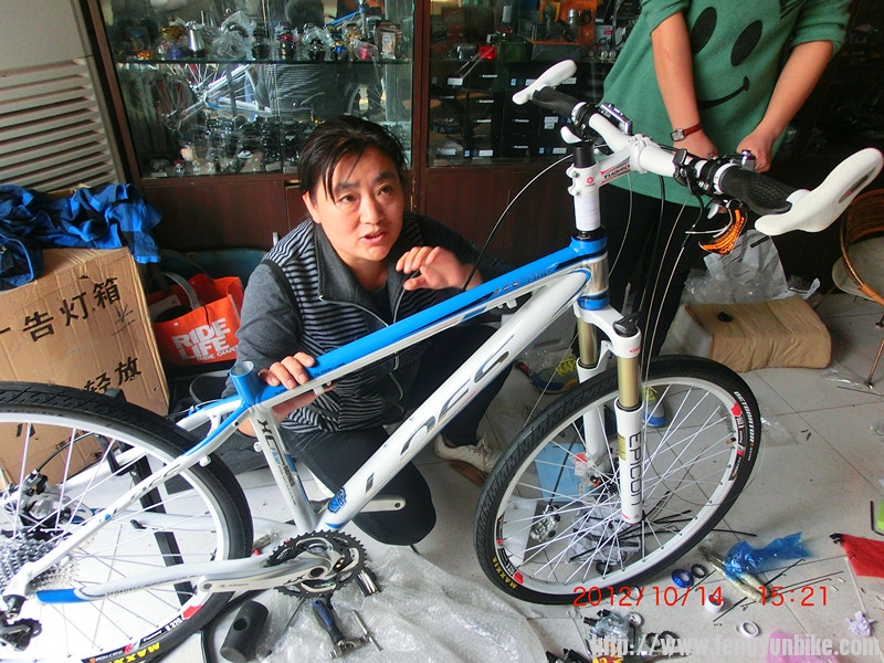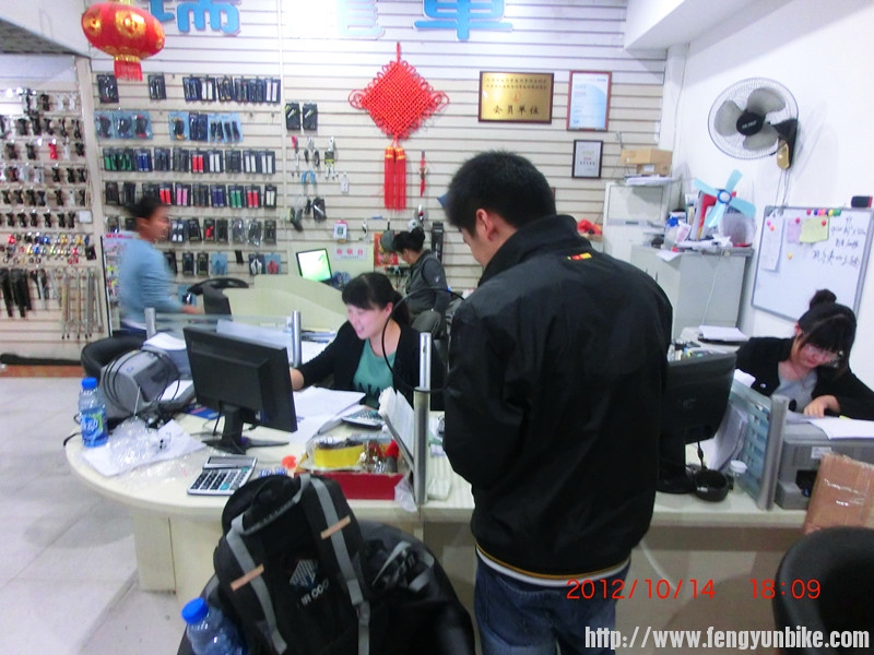 忙活了大半天,几近完工了,这时店老板驾着车4+2玩回来了,进门就跟我们神聊,共同的爱好,相差无几的岁数,侃得很投机,听说我们是专门从北京来攒车的,立马亲自动手帮我们完成后续的收尾工作,还亲自试车并帮我们把新车装上了汽车。我们还相约,有机会一同来北京骑车,并把“风云单车”的大名留在了他的签字本上。