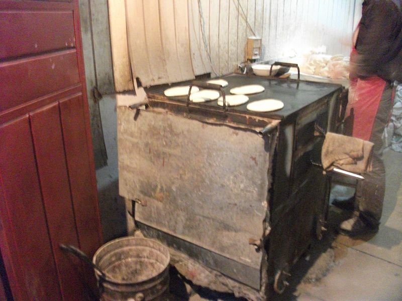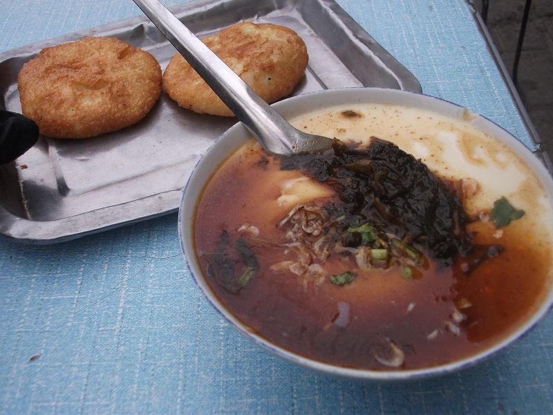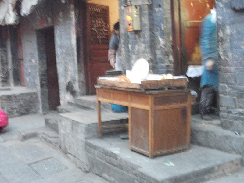 很“火”的一家小店,当时我还不知道做什么.过去一看是现做饼子的地方,价格吗。。5毛1个,没有什么味道,但买的人很多。过了一会才知道,然后这边买完饼子的人,都去前面买丸子汤泡饼吃去了- -!。