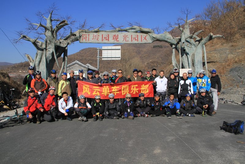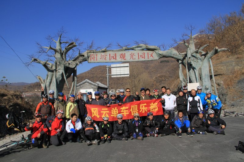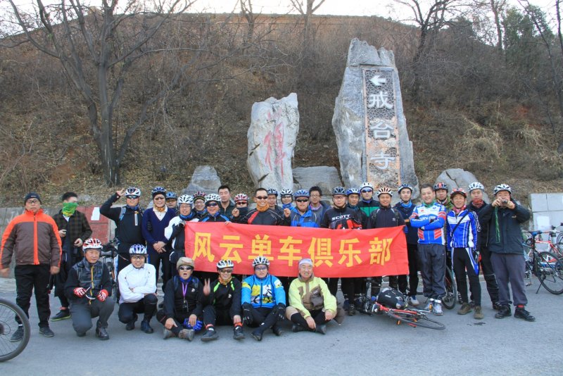 虽说这个周末预报的温度要低于上周,但没有风的早晨还是可以用快速骑行来温暖身体。由于早晨起的稍晚,为节约时间,直接赶到石门营环岛等候大部队。老远就见到已在这里等候的北京老石和夕阳二位大哥。没聊一会儿,就见成长带领着大队人马来到了,多数都是熟悉的面孔。稍事休息开始点名、提安全要求,出发。 开始向第一站戒台寺前进的路上,因两旁施工地段较多、机动车也比较多,尘土较大。本来早晨就有些雾霾,这会儿真希望能带个好口罩。好在就是前面的一段,一两公里后就可以大口吸气了。天气冷的缘故吧,路上骑友不多,偶尔有一个单飞的,成队的就追上了一拨据说是京西帮的年轻车友。结果是一路同行,后来他们也有几个骑上了雷达站。在戒台寺的石碑处进行了大合影后,成长带领大家继续向潭柘寺前进。一路距离不长,基本是小放坡,很快就到了石牌坊处,订好了午饭后,就开始爬坡上潭柘寺。这段距离也不太长,到了潭柘寺基本没有停的,继续向阳坡园行进。这段距离和坡度都稍增加了一些,但强度还不算大。很快大家就到达了原定的目的地——阳坡园观光园的门牌楼处。