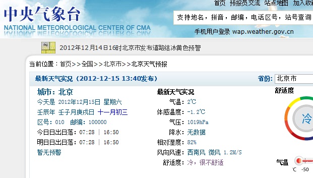 中央气象台查询北京实时气象参数的网址为:http://www.nmc.gov.cn/publish/forecast/ABJ/beijing.html