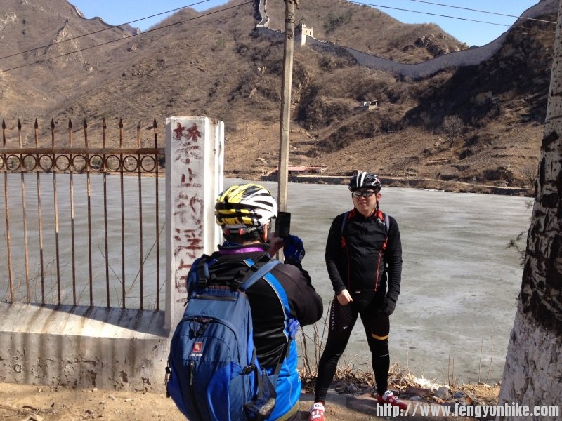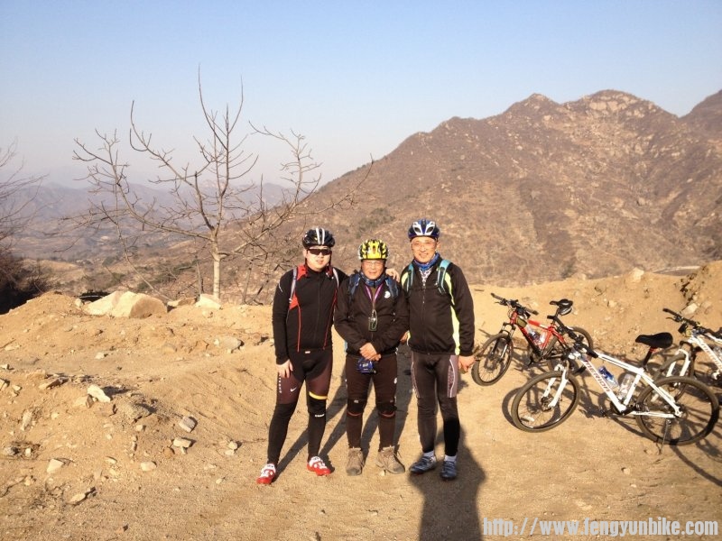 在庙上与菜哥会师之后一起接着放坡,来到黃花城水库边上,停车照相后,三人一起杀到九渡河处的金马驹歺馆。一周后咱又再次坐上了热炕头。此时刚过两点。两条鱼、三个菜、八个贴饼子和我带来的两个咸鸭蛋,剩下了不少,三个人战斗力不太强。吃饭喝茶休息了一个半小时,三点四十分,启程返回,二十几分钟后反爬到慈悲峪山顶的垭口处。等菜哥上来按驰鹿队惯例在此合影。菜哥带来消息,说途中天下独行给他打电话,正在向兴寿骑行,准备在那里与我们会合。哈哈!四人两会!
