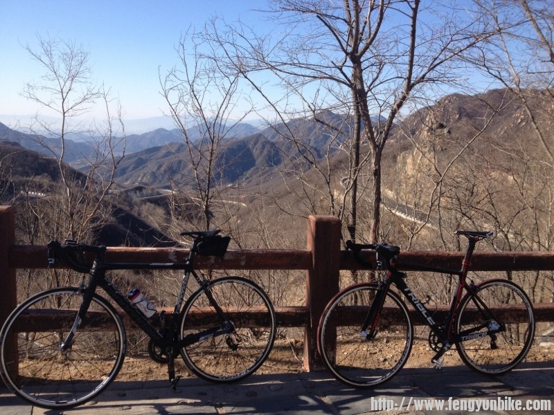 安四路的北端开始爬坡,但并不太陡,二十几分钟骑上山顶垭口处,一点过五分。给菜哥打电话,得知他已经到达庙上,正在路边歺馆小吃休息。我们照完相后立即下山,刚拐过两个弯,前面是一个很大的观景台,立即停车上去照相。这里比山顶的视野开阔了许多,的确是观景的好地方。继续放坡下山,自我感觉这边的弯道、坡度和长度能与妙峰山有一比。因为,从城里骑过来,要经过黑山寨或正爬慈悲峪,再正爬四海的话,难度要大过妙峰山。