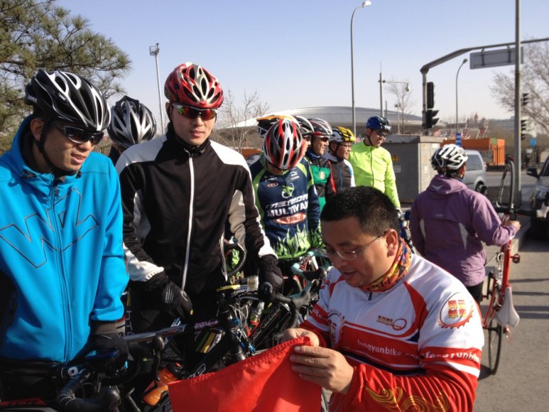 早上起床,出门前的功课做完之后,4+2,把自行车塞进后备箱里,骑车行头,装包拎袋,驾车出发,一路顺畅,提前到场,品茶寒暄,旧情新况,交流妥当,合拍击掌,酒席款待,饮料抵挡,三巡谢客,告辞转场,国贸老山,东西路长,按点抵达,老山外场,装轮更衣,骑行前往,集合地点,人未全齐,终于赶上!