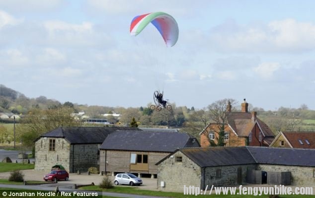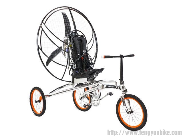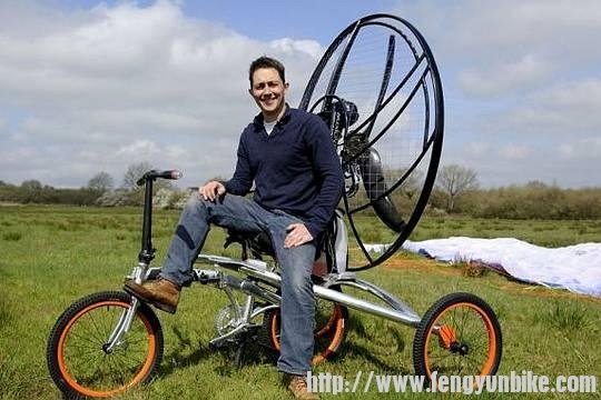 约翰福尔东和扬尼克里德花费两年发明这款名为“Paravelo”的飞行自行车。车子由一辆普通两轮自行车后挂两轮拖车组成,拖车上有风扇、马达和降落伞。在任意开放场地,打开飞行自行车的马达,风扇转动,鼓起降落伞充当翅膀,自行车逐渐起飞。