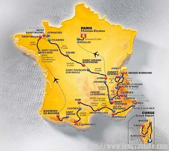 6月29日至7月21日期间,2013年环法自行车赛即将打响,今年是环法第100届赛事,赛事所经过的城市将会举办丰富多彩的庆祝活动,比赛将第一次从科西嘉岛发车,途径法国著名的旅游胜地圣米歇尔区,在阿尔卑斯山的两个爬坡赛段将是巨大的挑战,最后将在巴黎著名的香榭丽舍大道上收官。