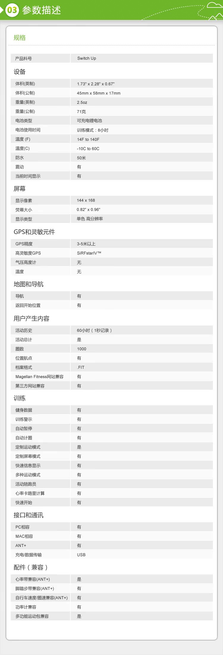 · 体积(英制)1.73"x 2.28" x 0.67" · 体积(公制)45mm x58mm x 17mm · 重量(英制)2.4oz · 重量(公制)69克 · 电池类型可充电锂电池 · 电池使用时间训练模式:8小时 · 温度 (F)14F to140F · 温度(C)-10C to60C · 防水50米 · 震动(仅SWITCH UP) · 手表模式--(有) 屏幕 · 显示像素144 x 168 · 荧幕大小0.82" x 0.96" · 显示类型单色 高分辨率 GPS和灵敏组件 · GPS精度3-5米以上 · 高灵敏度GPS SiRFstarIV™ · 气压高度计(仅SWITCH UP) · 温度(仅SWITCH UP) 定位和导航 · 导航--(有) · 返回开始位置--(有) 用户产生内容 · 活动历史--60小时(1秒记录) · 活动总计--(是) · 圈数--1000 · 位置航点--(有) · 档案格式--.FIT · MagellanFitness网站兼容--(有) · 第三方网站兼容--(有) 训练 · 健身数据--(有) · 训练警示--(有) · 自动暂停--(有) · 自动计圈--(有) · 定制运动模式--(有) · 定制屏幕模式--(有) · 快速信息显示--(有) · 多种运动模式--(有) · 活动陪跑员--(有) · 心率卡路里计算--(有) · 快速开始--(有) 接口和通讯 · PC相容--(有) · MAC相容--(有) · ANT+--(有) · 充电/数据传输--USB 配件(兼容) · 心率带兼容(ANT+)--(有) · 脚踏步带兼容(ANT+)--(有) · 自行车速度/圈速兼容(ANT+)--(有) · 功率计兼容--(有) 多功能运动包兼容--(有)