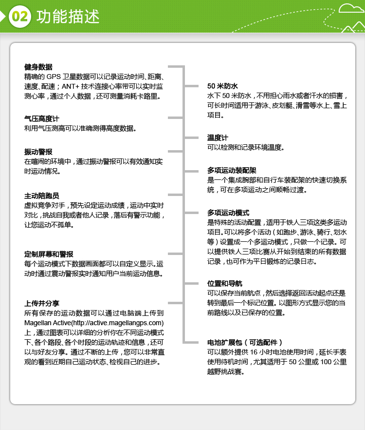 所有保存的运动数据可以通过电脑端上传到MagellanActive(http://active.magellangps.com)上, 通过图表可以详细的分析你在不同运动模式下、各个路段、各个时段的运动轨迹和信息,还可以与好友分享。通过不断的上传,您可以非常直观的看到近期自己运动状态、检视自己的进步。 o 多项运动装配架(选配)