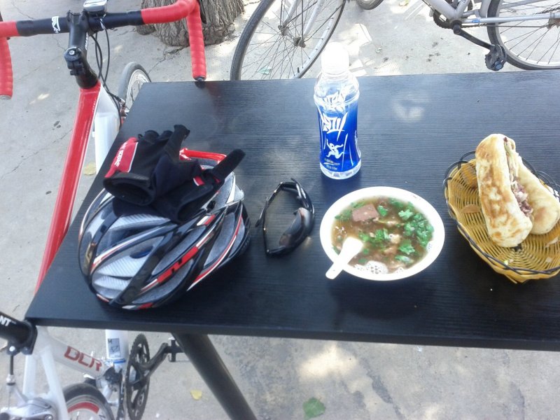 在崔村那里又饿了 也到中午了 找了个驴肉火烧 由于现在饭量小只要了两个火烧一碗驴杂汤 结果一端上来我就傻了 这也忒大了吧 硬着吃完了撑的够呛 歇一小会继续出发 过了一会越来越不适 肚子有种往上反的感觉 干脆慢慢推着车走吧 推了有七八公里吧 然后一路到家 113公里 骑行最远一次了 平时顶多有时夜班往返40多公里上下班